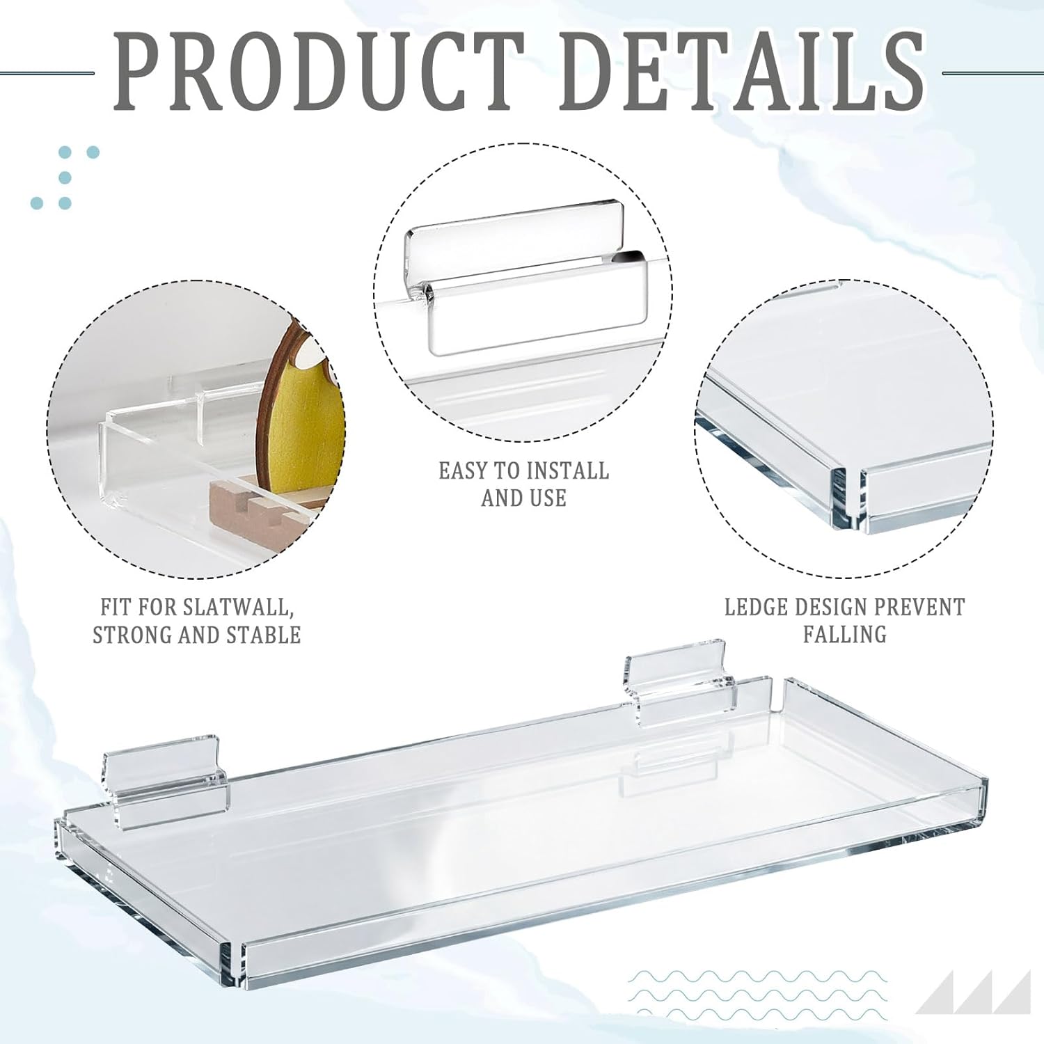 Features: Transform any unused wall space into a functional storage area with these garage slatwall shelves. Their wall-mount design effortlessly maximizes space efficiency without needing extra installation fixtures, allowing for easy integration into standard slatwall panels. Each shelf features a raised front fence to prevent items from slipping off, ensuring secure storage for delicate or valuable displays in retail, garages, or homes. Specifications: Material: acrylic Color: clear Size: 14 x 6 x 0.79 inches Package includes: 4 x Acrylic slatwall shelves Notes: Manual measurement, please allow slight errors on size. The color may exist a slight difference due to different screen displays