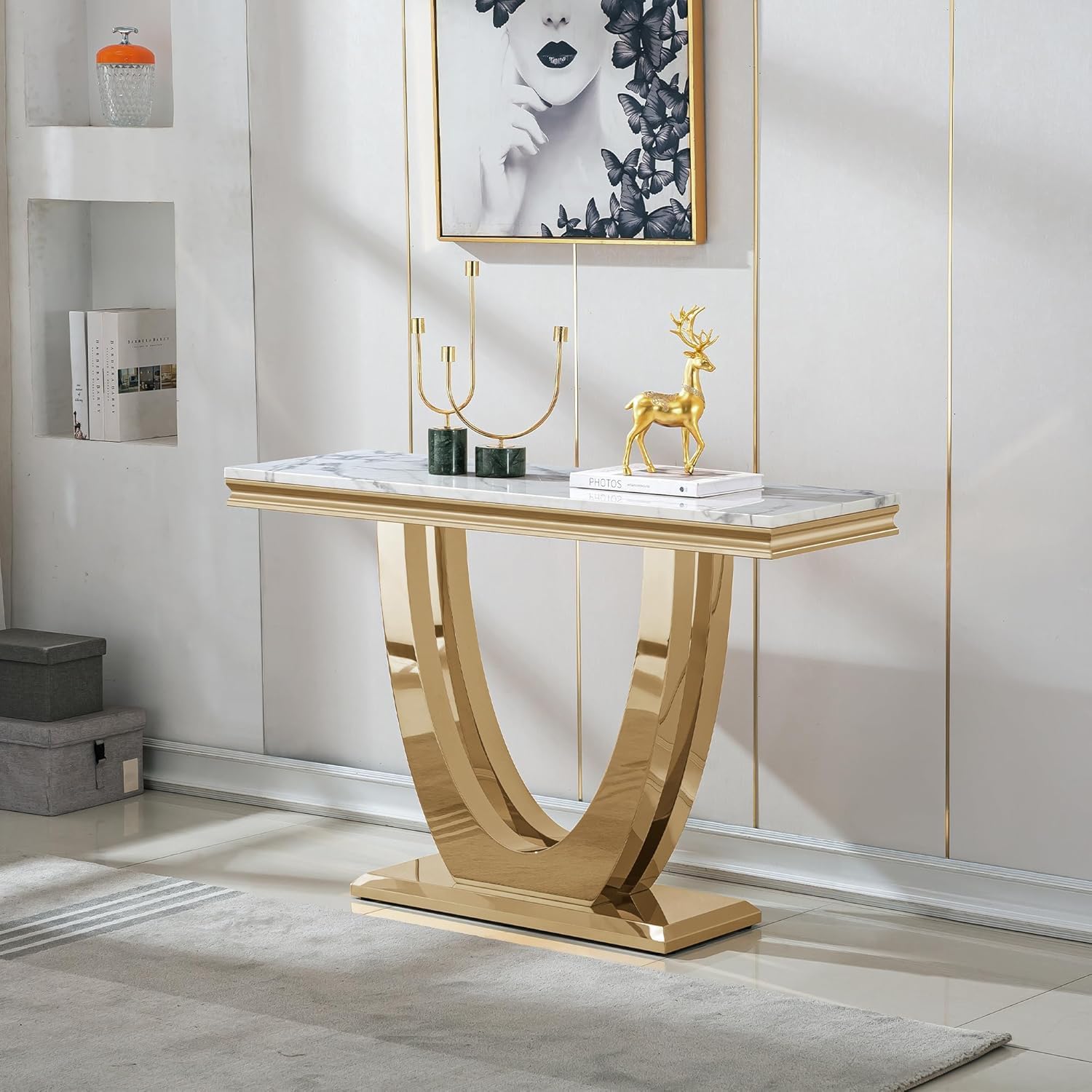 Bring a beautiful touch of modern to your home with the unique Coffee Table Set. With high glossy faux marble top and unique mirrored stainless steel frame, this living room table set is designed to stand out in your home. Stainless steel and marble top are easy to clean and durable for beauty that will last.Features:1. Elegant Style: Cabriole stainless steel base with gold/silver mirrored finish is the combination of classical and modern. Match with marble top to bring your home a whole new art style.2. High Quality Material: The tabletop is made of high quality faux marble, resistant to water & scratch-proof, not easy to break.Unique geometric shape gold/silver mirror finish stainless steel base stand out in their sturdiness & appearance.3. Aesthetic and Practical: Versatile and functional, its rectangular marble top offers the vintage and elegance feel that you are looking for in your dream home.The combination of marble and stainless steel makes this coffee table a perfect element to bring you the art of visure. The desktop has enough space to place that you need.4. Difference Options: You can find this coffee table in different color, thus being able to choose the one that best suits your home.5. Simple Assembly: With simple steps, an adult can complete the installation process in about 10-15 minutes. The clear illustrations in the instruction manual will assist users install this product smoothly.Specification1.Main Color: White+Gold / White+Silver2.Table Top Shape: Rectangular coffee table console table / Square side table3.Top Material: Faux Marble(MDF)4.Base Material: Stainless Steel5.Coffee Table : 46.85"L x 22.83"W x 17.72"H6.Cosole Table: 46.85"L x 14.96"W x 31.5"H7.End Table: 22.83" L x 22.83"W x 21.65"H