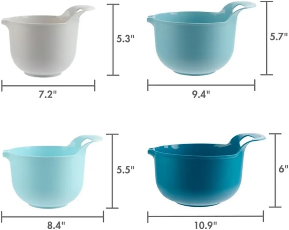 Make kitchen tasks easier with this 4-piece plastic mixing bowl set, designed with built-in handles and pour spouts for effortless mixing and mess-free pouring. The nesting design saves space in your cabinets, while the durable, lightweight construction makes them perfect for everyday cooking, baking, and serving in style.