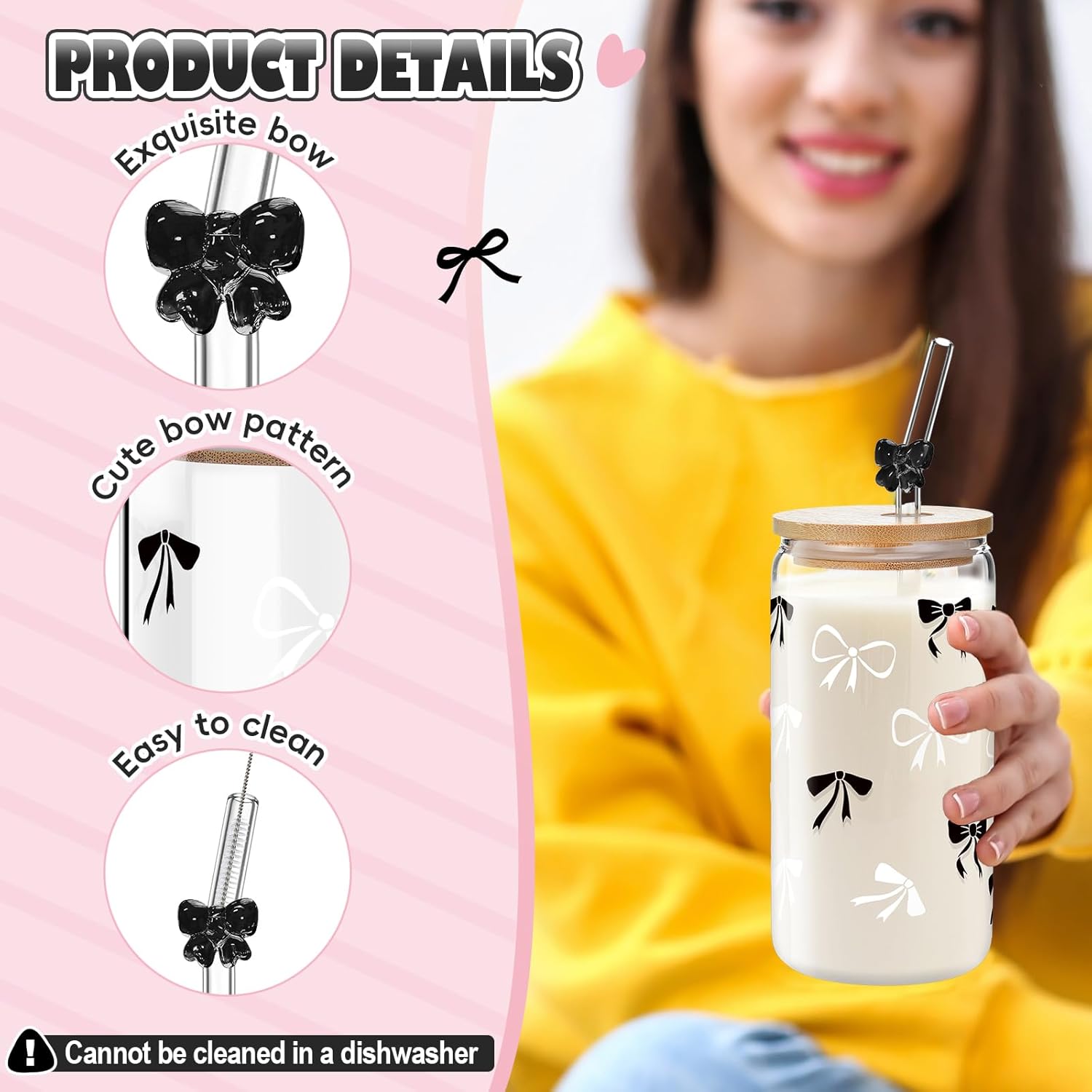 Features: Made from good quality glass and bamboo, these trendy glass cups are black in color and have a capacity of approximately 16 oz. The package includes four bow glass cups, four bamboo lids, and four glass straws. The cups are designed in a Coquette Aesthetic style proving to be visually pleasing. When caring for your glass cups, always remember to hand wash only. Avoid placing them in a dishwasher, oven, microwave, or high-heat machines. Do not use rough or abrasive materials to clean your glassware to prevent scratching the surface. With proper care, these cups will serve you for a long time. Specifications: Material: glass, bamboo Color: black Size: about 16 oz Package includes: 4 x Bow glass cups 4 x Bamboo lids 4 x Glass straws 4 x Cleaning brushes Notes: Manual measurement, please allow slight errors on size. The color may exist a slight difference due to different screen displays.