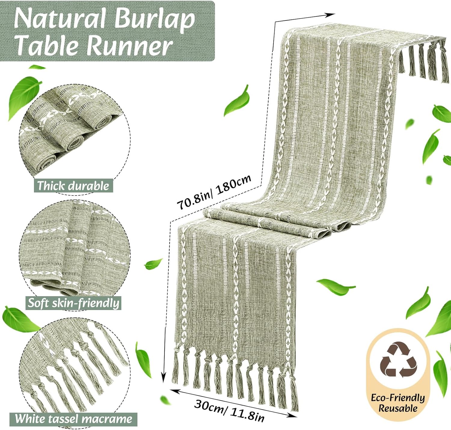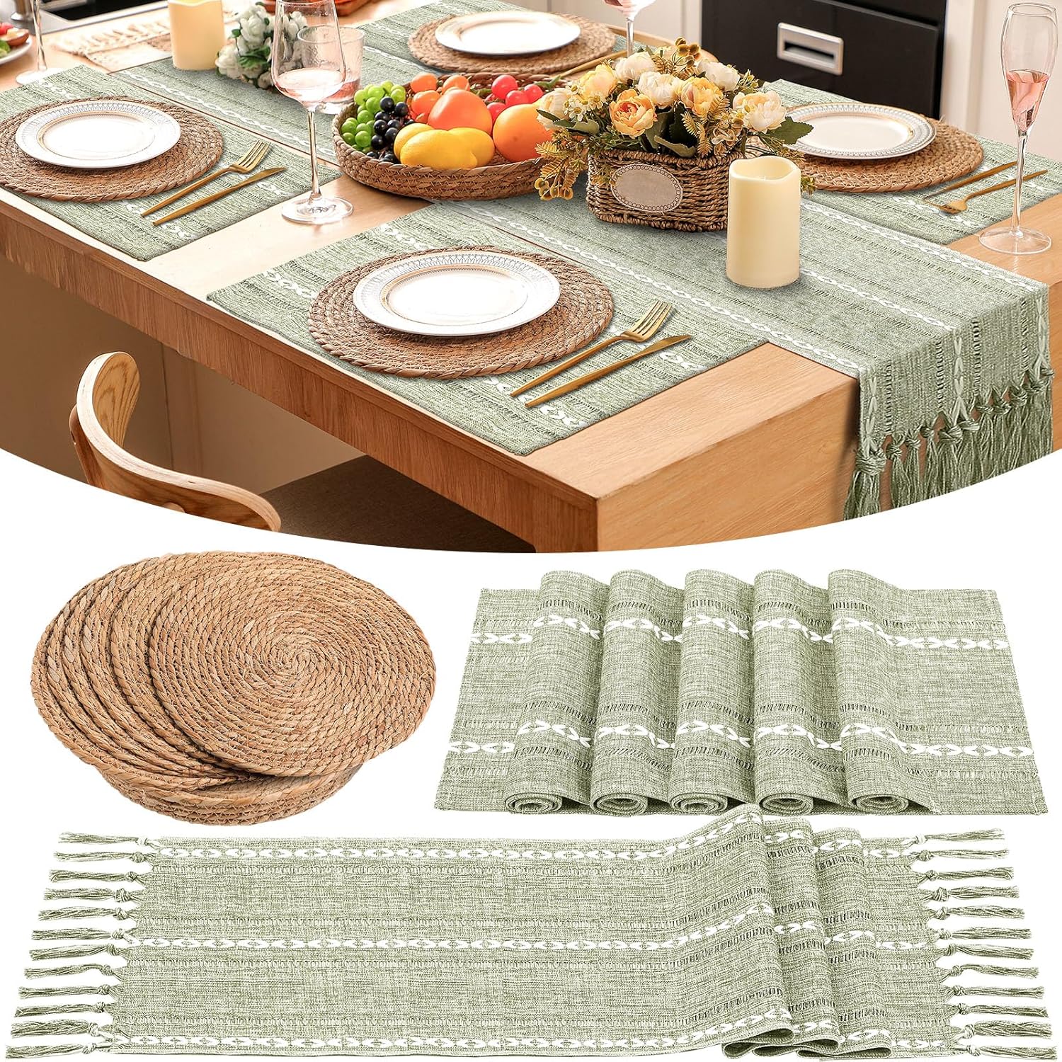 Features: The farmhouse braided placemats are nonslip to ensure your dishes stay put, even on smooth surfaces, their heat trait acts as a protective layer against hot plates and pots, keeping your tabletop or cloth safe from burns and dirt. Specifications: Material: round placemats and baskets: water hyacinth Rectangular sage green placemat and table runner: cotton, linen, polyester Color: green Size: rectangular sage green placemats: 11.8 x 19.6 inches Round placemats: 11.8 inches in diameter Long sage green table runner: 13 x 72 inches Package includes: 4 x Round wicker placemats, 4 x Rectangular sage green placemats 1 x Long sage green table runner, 1 x Woven baskets Notes: Manual measurement, please allow slight errors on size. The color may exist a slight difference due to different screen displays