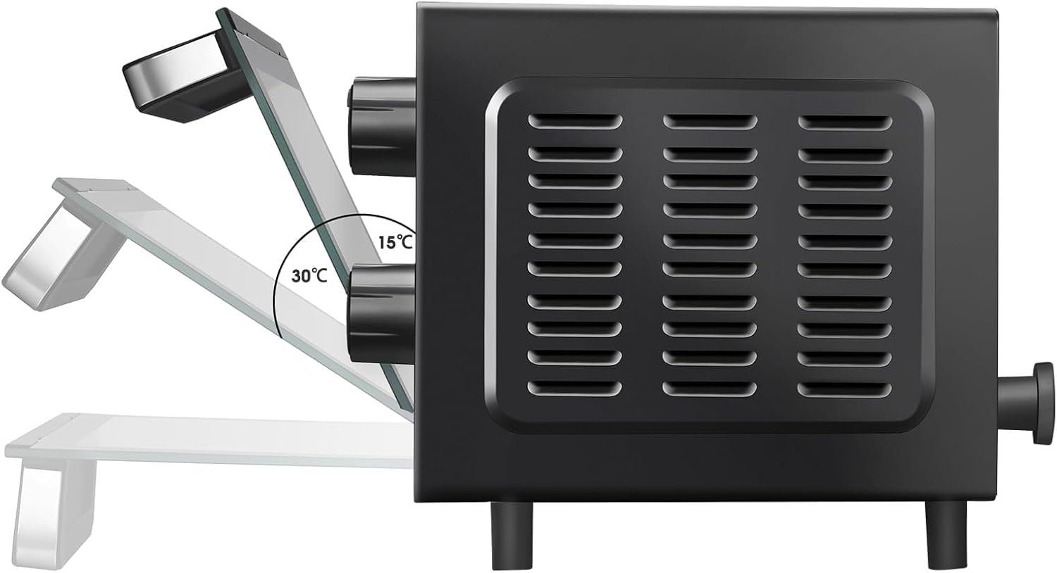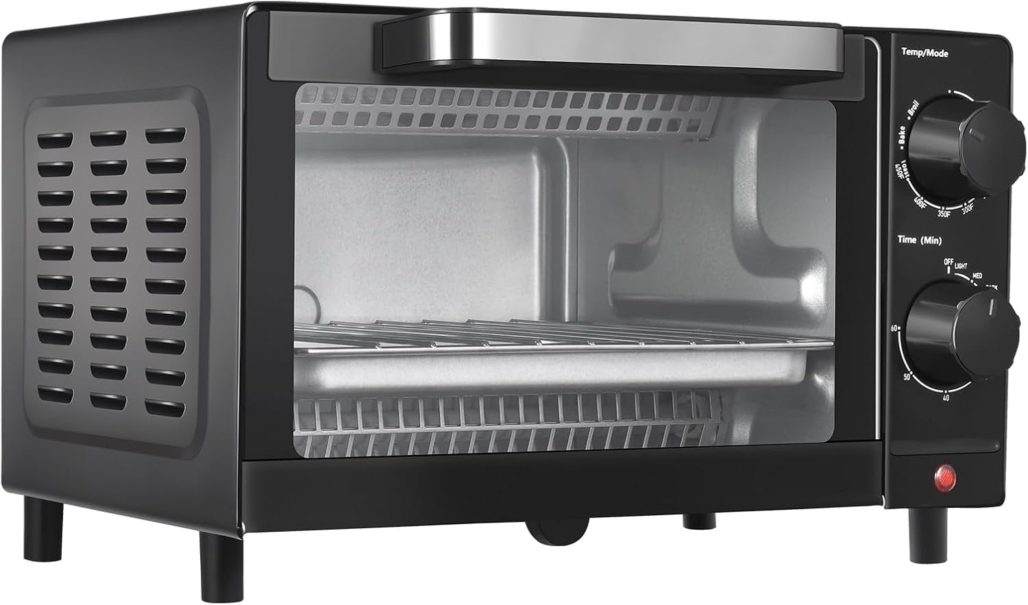 The 4 slice Toaster Oven make your live more convenient and efficient. Perfect for preparing toast, sandwiches, pizza and much more. The Toaster Oven can accommodate up to 4 slices of bread or a 9-inch pizza. The turn dial allows you to easily adjust the temperature mode and time settings. The compact size uses less energy and counter space and stores easily. Makes mealtime swift and smooth, especially in busy households. The sleek black finish will coordinate beautifully with existing kitchen decor and color palettes. Comes with baking rack and baking pan, simply wipe clean the oven for quick and easy cleaning. is sure to become a staple in your home cooking and baking ventures, bring new experience in your daily life.