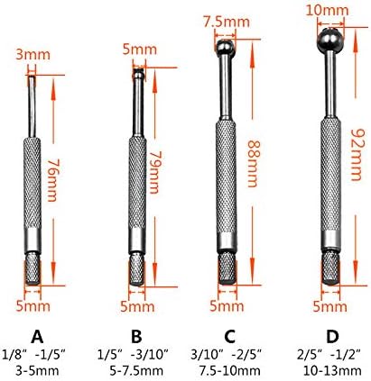 Features:4 sizes of gages are supplied in a fitted for .Smooth, sensitive adjustment for better feel, giving more accurate measurements.Used with an outside micrometer for measuring inside diameter of bores-.for Extra long for gaging deep and shallow holes, slots and similar work pieces.Gaging surface is fully hardened to insure long tool life.Specifications:Material: carbon steelGauge Ranges: 0.125-0.200,0.200-0.300,0.300-0.400,0.400-0.500"Probe Depth: 0.880,1.200,1.600,1.600 "Permits use in holes, slots and recessesPackage Includes:4 x Small Hole Gauge