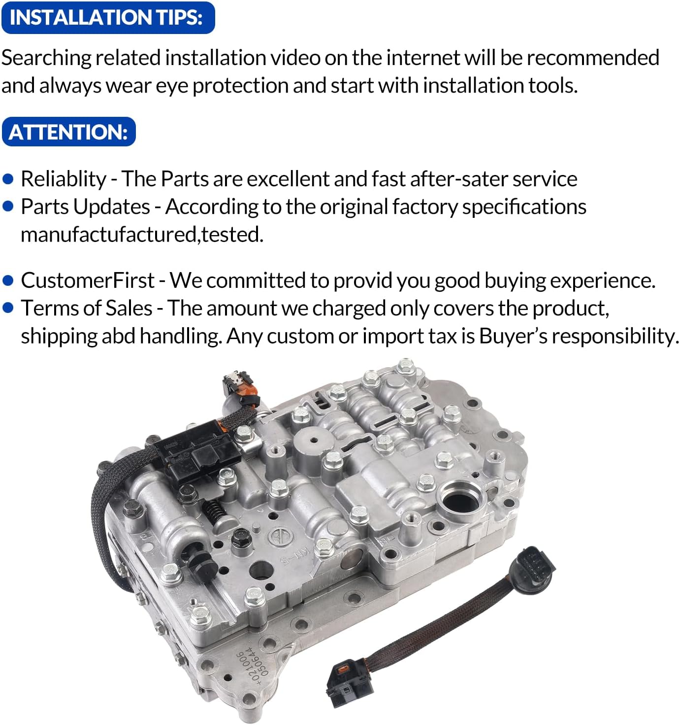 Fits the Following Vehicles:For Hyundai(4 SP FWD):00-14 ACCENT L3 1.5L L4 1.4L 1.5L 1.6L06-12 AVANTE HD/MD L4 1.6L 2.0L11-14 AVEGA L4 1.6L07-14 ELANTRA L4 1.6L 1.8L 2.0L06-09 GETZ L4 1.4L12-14 HB 4 L4 1.6L08-14 i20 L4 1.4L 1.6L07-14 i30 L4 1.4L 1.6L 2.0L12-14 ix20 L4 1.6L11-14 SOLARIS L4 1.4L 1.6L05-14 VERNA L4 1.4L 1.5L 1.6L09-13 MOINCA L4 1.8LFor Kia:(4 SP FWD)09-12 CARENS L4 1.6L07-11 D L4 1.6L 2.0L05-10 CERATO L4 1.6L 2.0L09-14 FORTE/FORTE L4 1.6L 2.0L12-14 K2 L4 1.4L 1.6L05-14 PRIDE L4 1.4L 1.5L 1.6L11-12 QIANLIMA L4 1.4L 1.6L12-14 RIO L4 1.4L 1.6L08-14 SOUL L4 1.6L 2.0L10-14 VENGA L4 1.6L2004-2009 Spectra / Spectra5 L4 2.006-09 SPECTRA/SPECTRA5 4 SP FWD L4 2.0LReference Part Number: A4CF1 A4CF2 82740D4621023020Advantage of Transmission Valve Body: 100% Perfect Performance Testing to match OE specification and performance Ensuring precisely matches, durability, reliability and premium performanceNO programming needed.All of our Valve Bodies are PLUG AND PLAYIMPORTANT NOTICE: Before placing the order, please check your car model in the Fitment Filter System in the top left corner. Compatibility information provided is for reference only. Please make sure to match the exact part numbers between this part and the part that you are replacing.