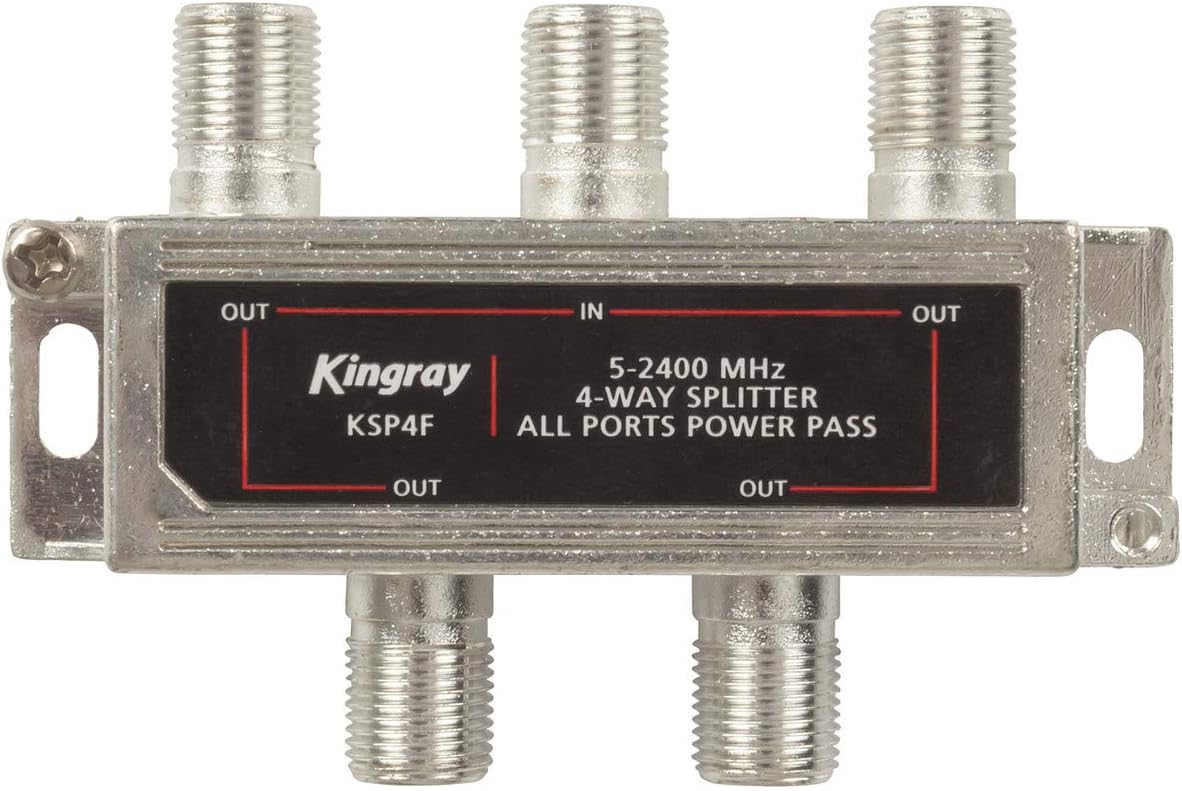 3 Year WarrantyThis class A digital ready F-type splitter is designed for peak performance across the entire terrestrial and satellite bands up to 2400MHz. It is compact in size and has excellent RF screening to reduce interference. Power pass on all ports allows power to pass through to a masthead amplifier or satellite dish LNA. 1 x F-type input to 4 x F-type out.Features:- Foxtel® Approved- Power-Pass- 1 In, 4 Out- Can be Wall Mounted- >100dB RF ShieldingSpecificationsTV Antenna Splitters Type of Plugs/Sockets F Type Number of Outputs 4.00000000ch Housing Material Metal Frequency Bandwidth 5.00000000MHz Insertion Loss 4.00000000dB Power Pass true RF Screening true Weather Proof true Product Availability Availability Stocked item Product Dimensions Width 84.00000000mm Height 50.00000000mm Depth 13.00000000mm Weight 50.00000000g