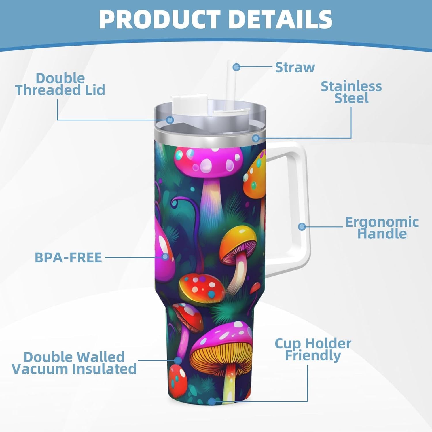 This Bright Mushrooms Art Print Ice Bully Cup features a double layer stainless steel design that can be used for a long time without rusting. The lid has good sealing to prevent water from overflowing, and it is easy to unscrew for filling and cleaning. It can keep water, coffee, or drinks warm or cool for hours and is suitable for travel, camping, and driving.