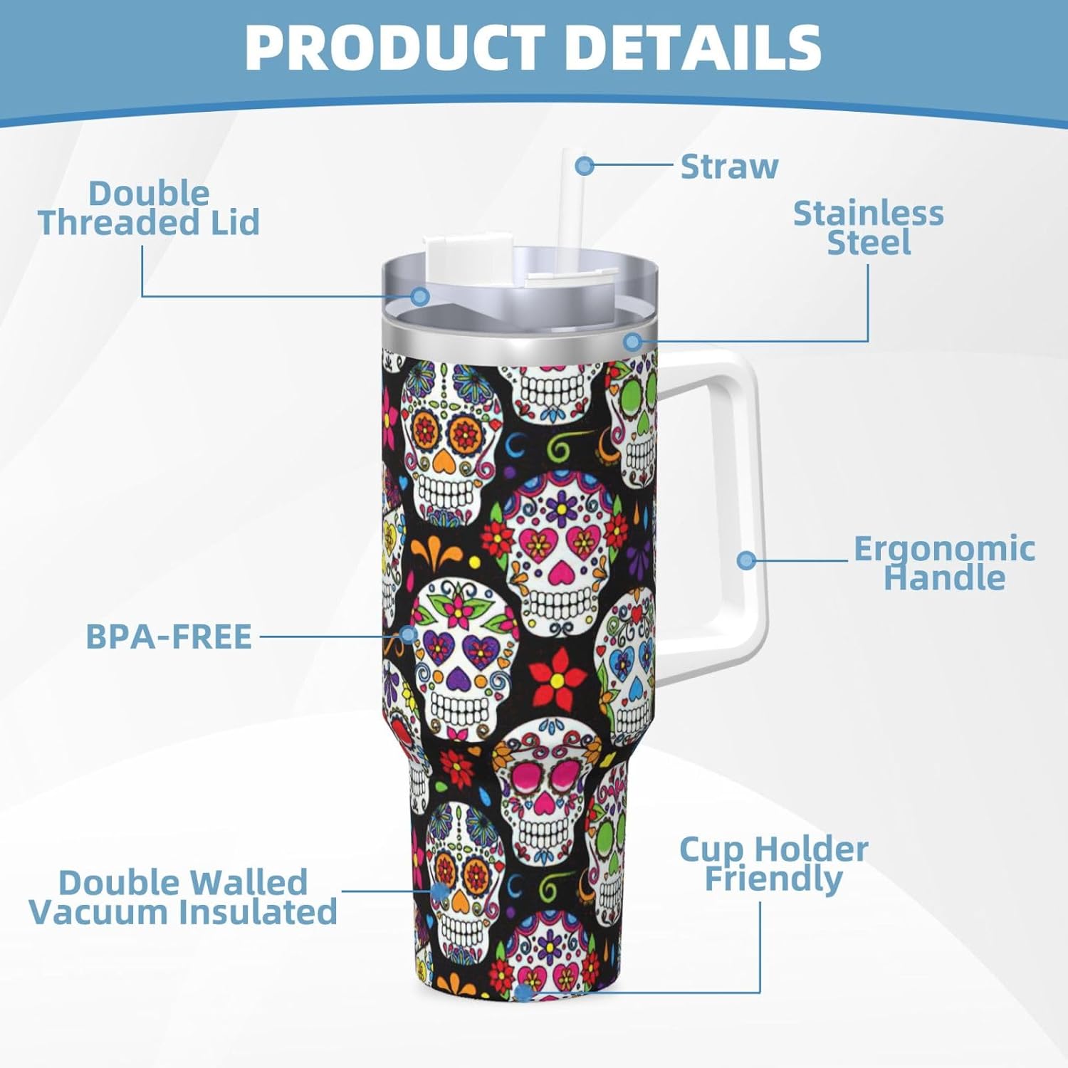 This Colorful Flower Skulls Print Ice Bully Cup features a double layer stainless steel design that can be used for a long time without rusting. The lid has good sealing to prevent water from overflowing, and it is easy to unscrew for filling and cleaning. It can keep water, coffee, or drinks warm or cool for hours and is suitable for travel, camping, and driving.