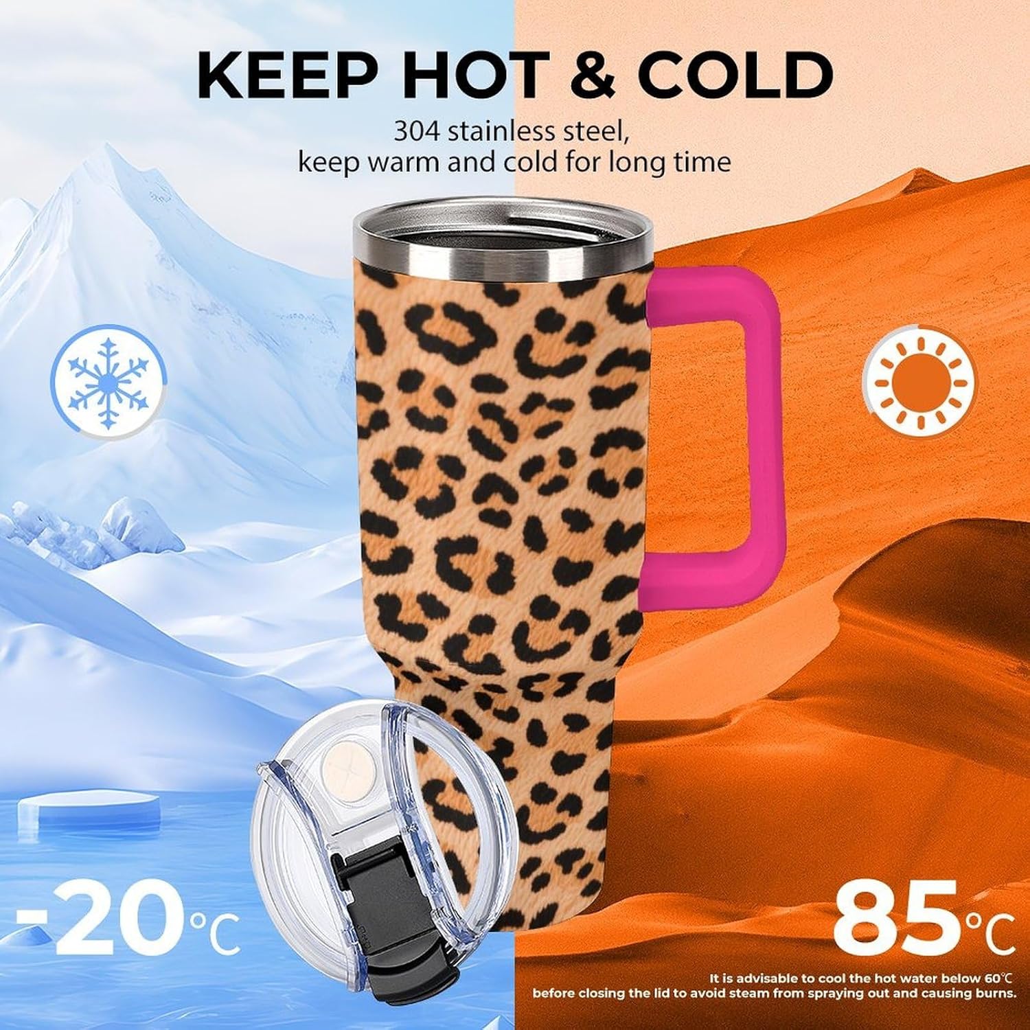 Whether you're on a long drive, a busy commute, or an outdoor adventure, staying hydrated is crucial. Our large-capacity car tumblers featuring the Mini Honeycomb Leopard Print pattern were developed with this need in mind. They're the perfect solution for on-the-go hydration, ensuring a smooth and comfortable journey. With an impressive 40-ounce capacity, this insulated stainless steel travel tumbler easily meets your frequent hydration needs, from your morning commute to your after-get off work workout or even a full-day road trip. Without constantly searching for water, you can focus on the road ahead and say goodbye to thirst. Whether you're sweating it out on a scorching summer day or sweltering in your car on a dry winter night, staying hydrated helps you perform at your best. We understand your appreciation for quality and aesthetics, and our car tumblers feature unique designs that complement any vehicle's interior, exuding understated elegance. More than just a practical tool, they're the perfect finishing touch, adding a touch of style to your vehicle's interior.