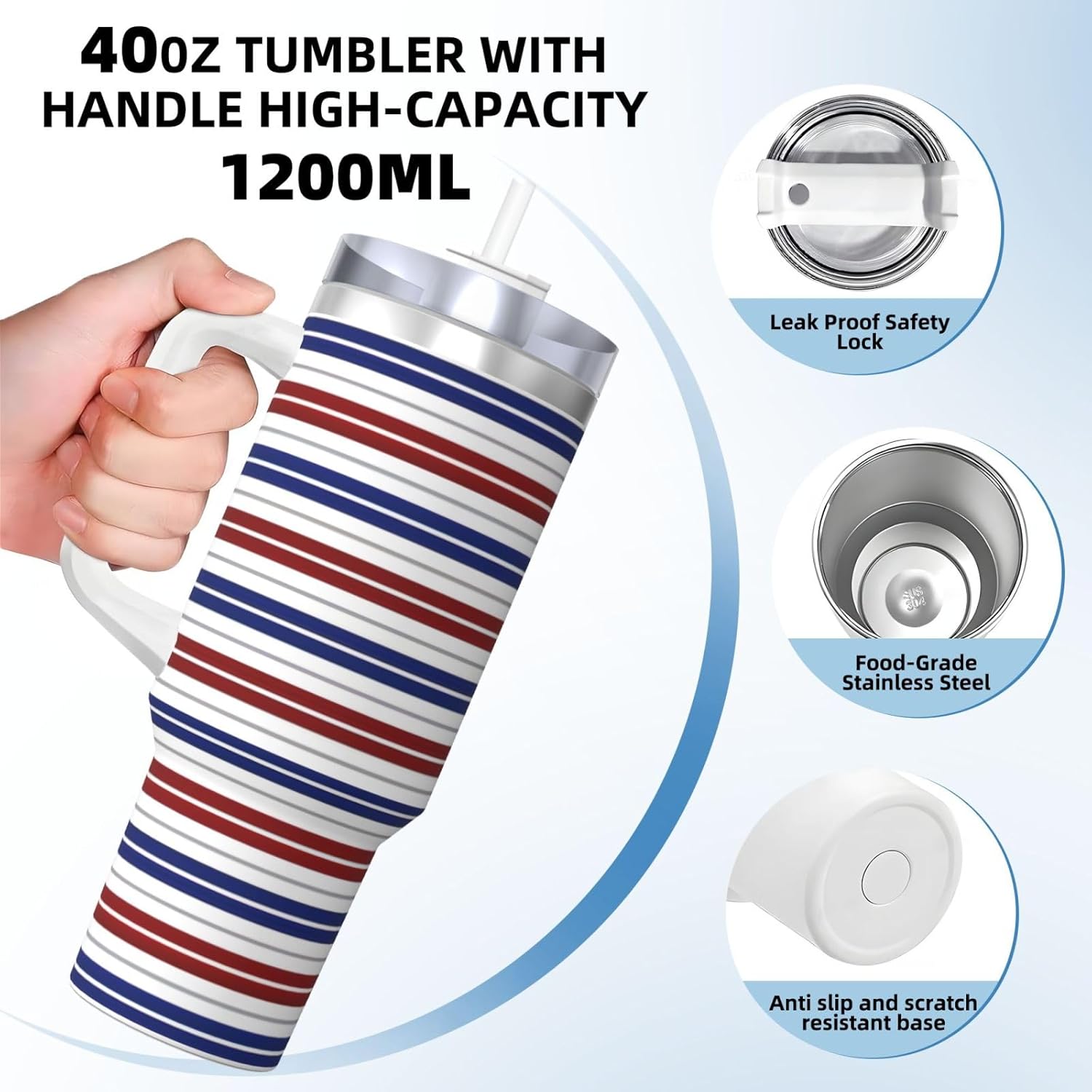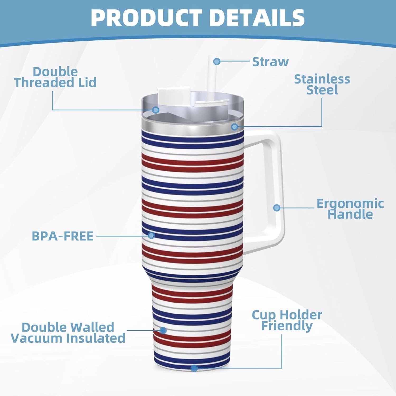 This Red Blue White Gray Stripes Print Ice Bully Cup features a double layer stainless steel design that can be used for a long time without rusting. The lid has good sealing to prevent water from overflowing, and it is easy to unscrew for filling and cleaning. It can keep water, coffee, or drinks warm or cool for hours and is suitable for travel, camping, and driving.