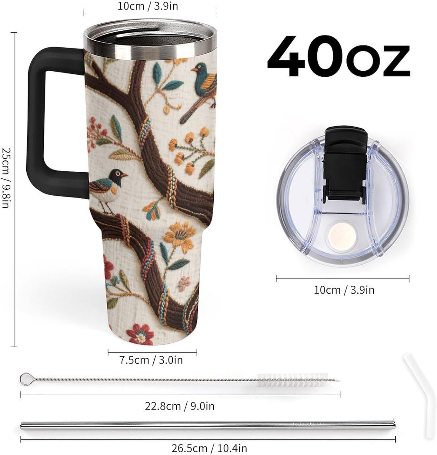 40 oz Tumbler: Keep Your Drinks Hot or Cold for Longer Perfect for long trips or days at the beach, this 40 oz thermal tumbler keeps your drinks at the perfect temperature for hours. The Tumbler is made from 304 stainless steel and fits standard cupholders, and with a variety of pattern options, you can get an Emotional Support Water Bottle. Its double-wall stainless steel design ensures optimal insulation, while the leak-proof lid prevents spills. Plus, its 180-degree rotating handle adds convenience and practicality to your daily adventures. Capacity: 40 oz (approx. 1.2 liters) Double-wall insulation Leak-proof lid 180-degree rotating handle Enjoy your favorite drinks anytime, anywhere with this versatile and practical thermal tumbler! Tumbler is double walled and vacuum insulated to keep your drink hot or cold for hours. The cup is outfitted with an ergonomic handle, that is aesthetically designed for comfort. It comes with a straw lid and two straws so you can enjoy your favorite beverage on the go.