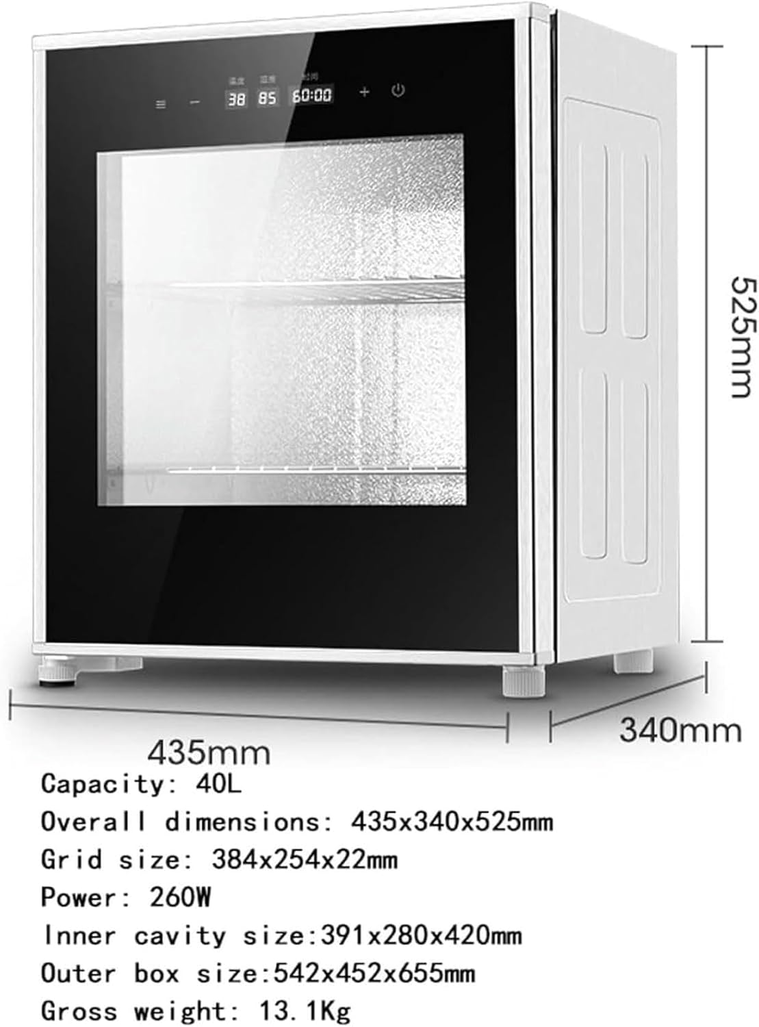 Budget:Name: Professional Bread FermenterColour: silver.Power: 260WNominal capacity: 40LTemperature range: 20-50°CFood insulation: 40-50℃Yogurt: 40-50 ° CDough fermentation, First time: 28°C, Dough fermentation, Second time: 38°CNato: 36°CFermented rice: 28-35°CExternal dimensions: 435 x 340 x 525 mm.Inner cavity size: 390*275*420mmGrid size: 384*254*22mmGross weight: 13.1 kgProducts include:1 x Electric Dough Fermenting Machine