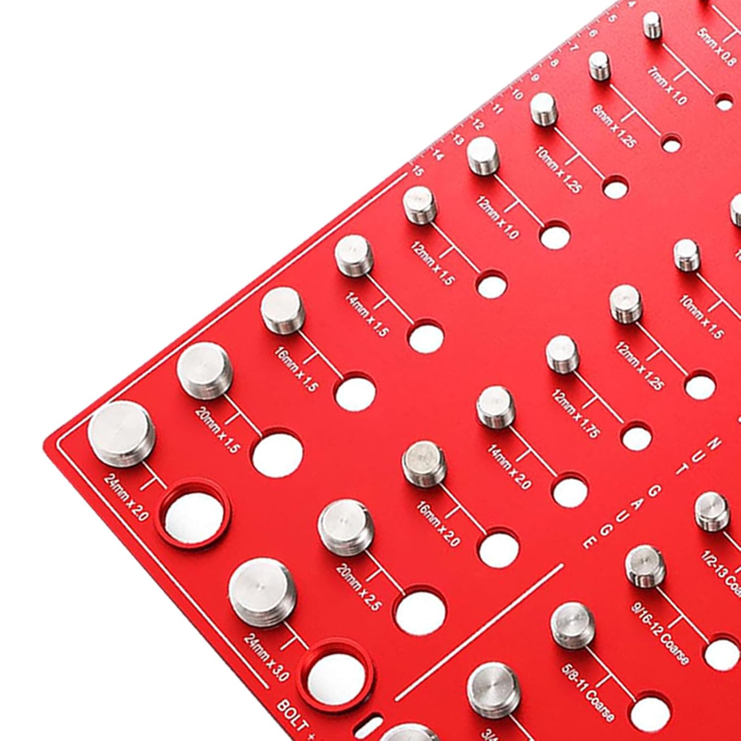 1. WIDE RANGE OF SIZE CHECKING: Nut and bolt thread detector can help you identify 44 distinct sizes of nuts and bolts, featuring metric thread sizes spanning from M3x0.5 to M24x3.0 and Imperial thread sizes ranging from 6‑32 Coarse to 1‑12 Fine, which can help you identify different sizes of nuts and bolts quickly and easily2. TIME SAVING AND USER FRIENDLY: This red nut and bolt thread detector is necessary to quickly identify the most common nut and bolt sizes3. MULTIPLE OPTIONS: Bolt size thread identifier come with 44 holes to choose from, you can measure nuts and bolts in a variety of sizes, including metric and imperial sizes. This make the tool highly suitable for a variety of tasks and industries4. CONVENIENT AND DIRECT: This thread checker is very convenient and easy to use. Simply insert the nut or bolt and determine dimension directly, eliminating the need for time consuming measurements5. PRE DRILLED MOUNTING HOLES: Nut and bolt thread checker is designed with 2 pre drilled mounting holes on the top, easy to hang on the wall when you're done using or attach to your toolbox for easy access when you needSpecification:Item Type: Nut Bolt Thread CheckerMaterial: Aluminum alloyIncluding Metric Sizes: M3x0.5, M4x0.7, M5x0.8, M6x1.0, M7x1.0, M8x1.0, M8 x1.25, M10x1.0, M10x1.25, M10x1.5, M12x1.0, M12x1.25, M12x1.5, M12x1.75, M14x1.5, M14x2.0, M16x1.5, M16x2.0, M20x1.5, M20x2.5, M24x2.0, M24x3.0Including Inch Sizes: 6-32, 8-32, 10-24, 10-32, 1/4-20, 1/4-28, 5/16-18, 5/16-24, 3/8-16, 3/8-24, 7/16-14, 7/16-20, 1/2-13, 1/2-20, 9/16-12, 9/16-18, 5/8-11, 5/8-18, 3/4-10, 3/4-16, 1-8, 1-12Package List:1 x Nut Bolt Thread Checker