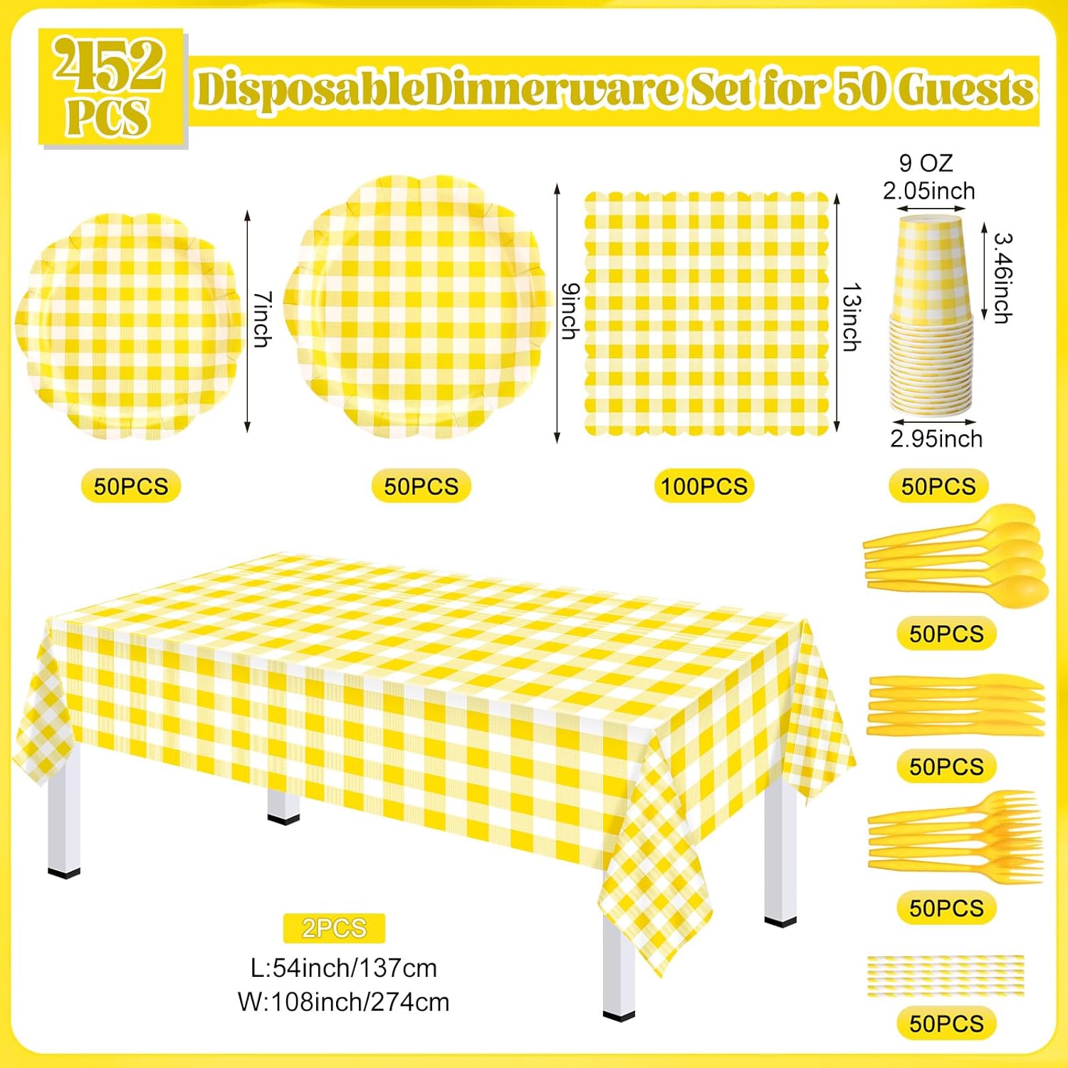 Features: Emphasized with fresh yellow color, our gingham party supplies are designed to add elegance and joy to your celebration. Our yellow party supplies feature a variety of sizes to cater to your requirements, the paper plates come in 9 inches and 7 inches in diameter, ample space for meals and snacks. Our cups hold around 9 oz of beverages, ideal for serving beverages. The PE plastic tablecloth spans broadly to a size of about 54 x 108 inches. Specifications: Material: Plate, cup, napkin, straw, paper Tablecloth: PE plastic Knife, fork, spoon: plastic Main color: yellow and white Size: Paper plate: about 9 inches/ 23 cm, 7 inches/ 18 cm in diameter Cup: about 9 oz in capacity Napkin: about 13 x 13 inches Tablecloth: about 54 x 108 inches/ 137 x 274 cm Straw: about 8 inches/ 19.7 cm long Package includes: 100 x Paper plates 50 x Coffee cups 100 x Napkins 2 x Tablecloth 50 x Knife 50 x Forks 50 x Spoons 50 x Straws Notes: Manual measurement, please allow slight errors on size. The color may exist a slight difference due to different screen displays. Pointed items are included, please be careful when using, and please keep them away from kids.