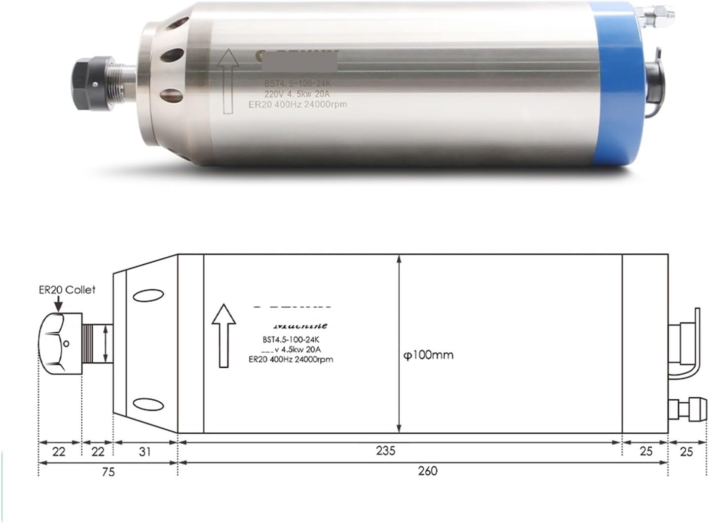 Slotting Cutter ArborsSize: 100x260mm (middle body diameter: 100mmx length: 260mm)Material: 304 stainless steel jacket, water jacket is die-cast aluminum tube, high temperature resistant copper coilSpeed regulation mode: 0-24000 stepless speed regulation can be achieved by adjusting the inverter output voltage and operating frequencyCooling method: water coolingPower: 4.5KWVoltage: 220V/380VCurrent: 20A/12AFrequency: 400HzSpeed: 0-24000rpmRunout deviation: 0.01mmDiameter(mm):100Bearing type: 4 ceramic bearingsChuck: ER20Clamping knife diameter: 1-13mm, 3.175mm, 6.35mm, 12.7mmWater-cooled ER20 chuck block