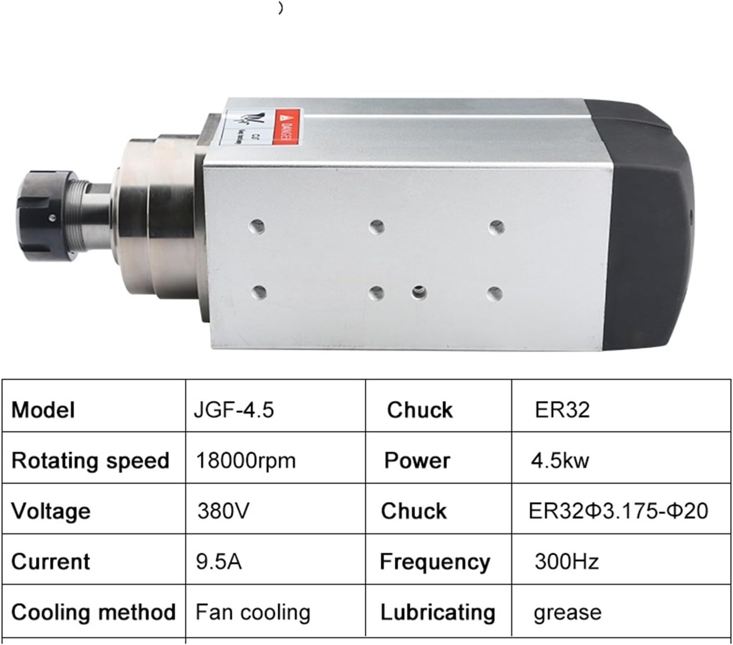 Slotting Cutter Arbors1PC 380v 4.5kw ER32 air-cooled spindle motor, no mounting flange, 4 bearingsModel: 4.5kw square air-cooled spindleSpeed regulation method: Change the spindle speed through the three-phase output inverter and adjust the frequency of the inverter.Cooling method: air coolingPower interface: Optional 5-pin waterproof aviation plug. The aviation plug is marked with "1", "2", "3", "4", "5", and "GND". "1", "2", and "3" are connected to the inverter (U, V, W), and "GND" is connected to the inverter ground.Power: 4.5kw (1HP=0.735w)Current: 9.5AFrequency: 0-300HzSpeed: 0-18000rpmJump: less than 0.01mmBearing type: 4 ball bearingsChuck: ER32Clamping tool diameter: 17mm, 16mm, 15mm, 14mm, 13mm, 12.7mm, 12mm, 11mm, 10mm, 9mm, 8mm, 7mm, 6.35mm, 6mm, 5mm, 4mm, 3.175mm, 2.0mm, 2.0mm, 1.5mm, 1mm (standard 4mm)