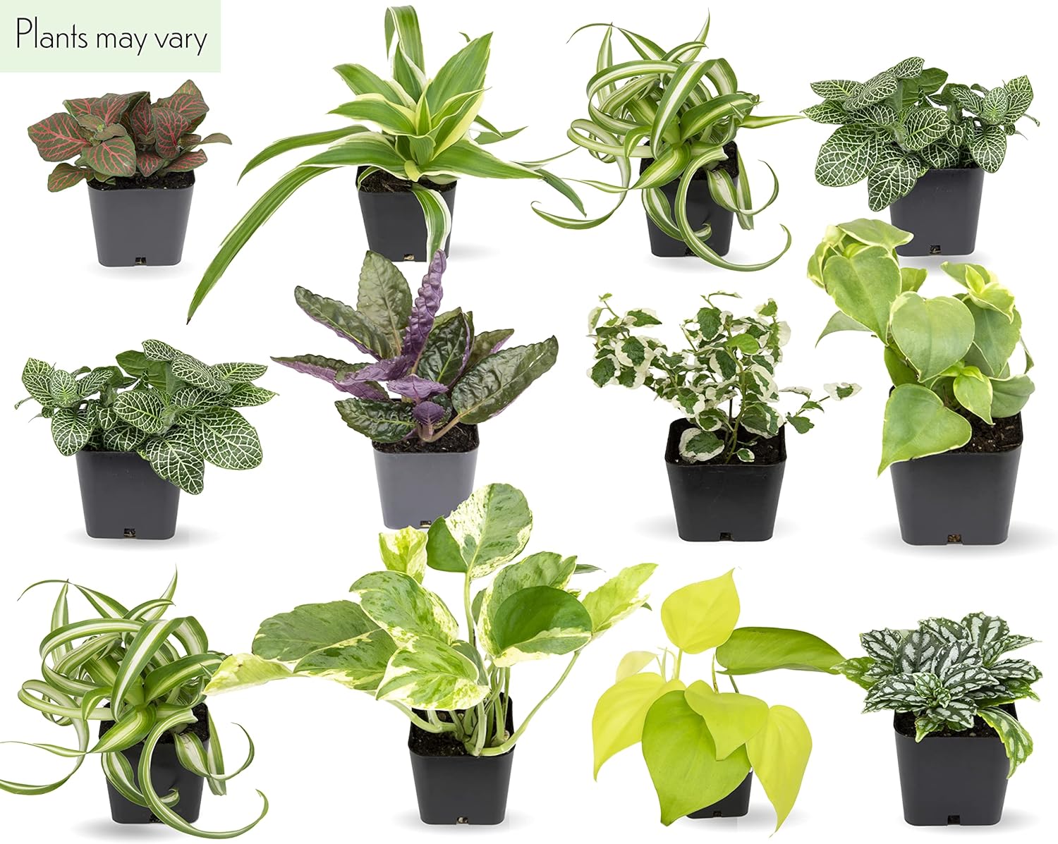 This 48-pack of easy to grow houseplants complements the 20-pack of assorted live succulent plants to create an indoor oasis. The houseplant pack contains a stunning variety of 48 plants like Fittonia, Pothos, Dieffenbachia, and Aralia plants. Known for their low maintenance and air purifying abilities, these plants feature glossy foliage in shades of pink, white, yellow and green that make them perfect for home decor. Combine them with the 20 eye-catching succulents, which require very little care but add vibrant pops of color and exotic shapes to any space. With smooth textures and charming flowers, the Aeonium, Aloe, Crassula, Echeveria, Kalanchoe and Sedum plants thrive in gardens and containers. Both plant packs are thoughtfully packaged and shipped directly to your home, arriving healthy and fully rooted so you can easily incorporate them into your living space. As natural accents that purify air, these 68 plants complement each other to create a beautiful indoor oasis requiring minimal maintenance.