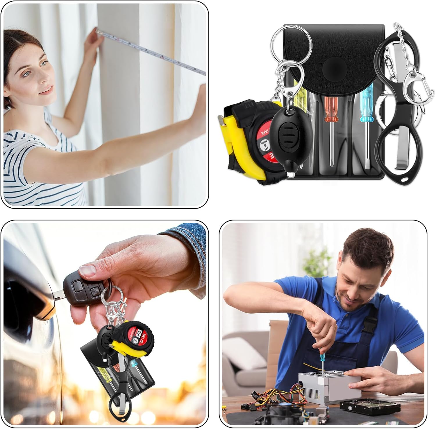 | Included Components | Mini Screwdriver Keychain, Tape Measure Keychain, LED Flashlight Keychain, Folding Safety Scissors, Nail Clippers Set, Survival Bracelet with Compass, 6 in 1 Multitool Pen, Opener Survival Credit Card Tool |