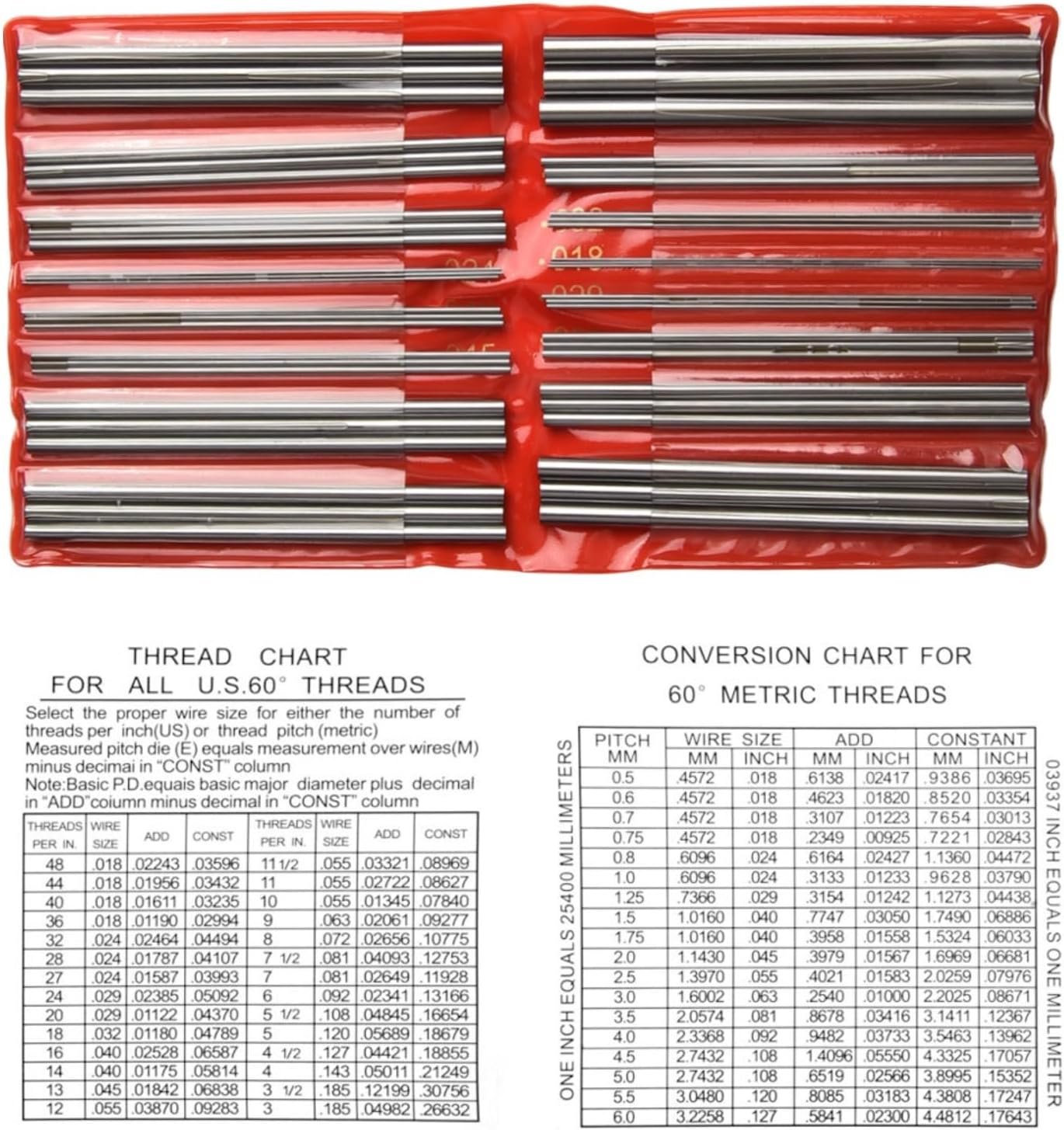 Product description Features:48 pieces, 16 different sizes for all 60 inch threadsMeasures 3 to 48 threads per inch and all metric threads, pitches from 0.5mm to 6mm.The 3-wire is the way to measure external threadsThe wires are packed in a plastic box with printed dimensions.Laminated charts are compiled according to US standards.Proper sizes available8-wire measurementThread charts for all US 60° threadsChoose the wire size for threads per inch (US) or pitch (metric) Metric measurement Pitch modulus (E) equals wire measurement (M) minus decimal in "CONST" column Manufacturer Contact Information no