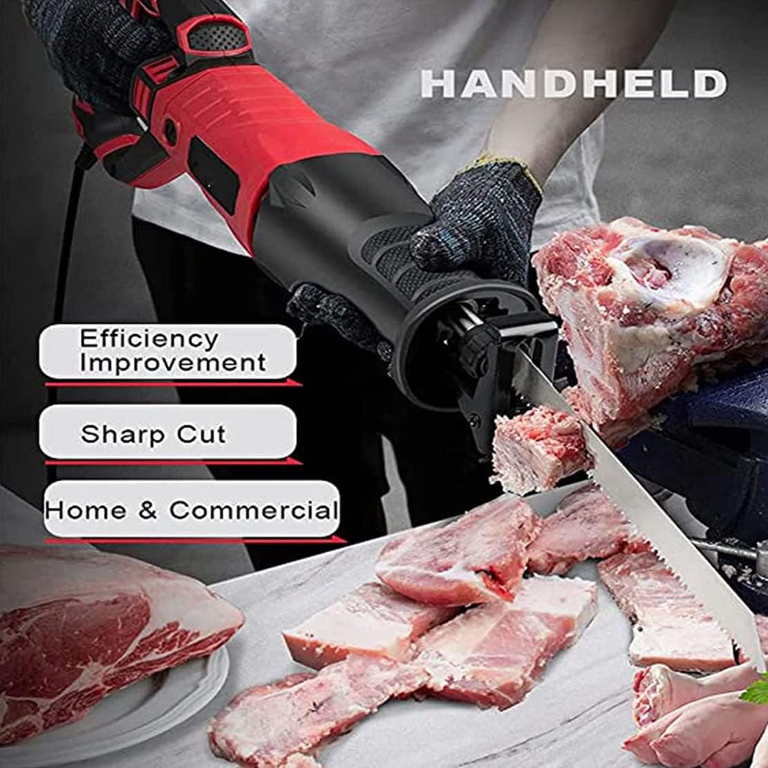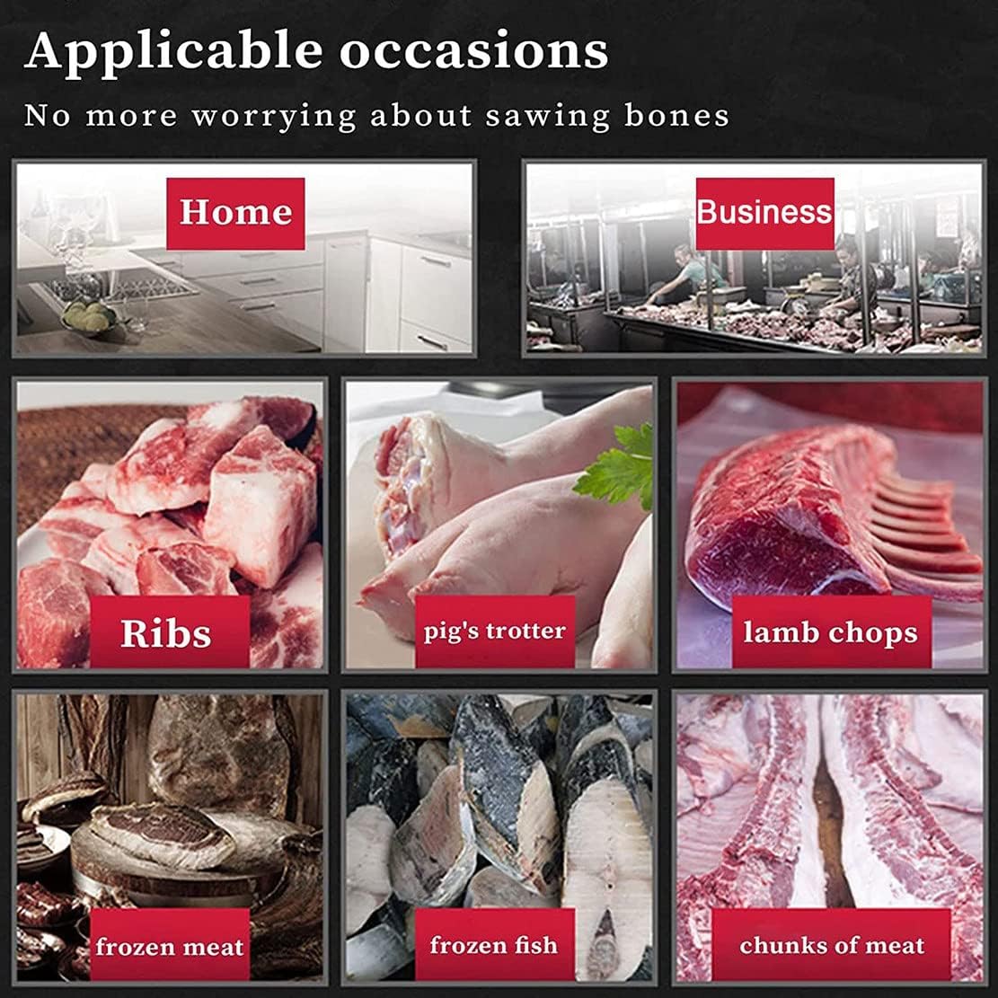 Do you encounter the situation that the meat cannot be cut due to freezing? our bone saw butcher electric can help you solve this problem. It cuts tough meats with ease, giving you the ideal size and shape. ▶Specification: Name: Butcher Bone Saw Saw blade material: Stainless Steel Rated power: 900W/1050W/1300W Reciprocating: 30mm Saw Blade: 24cm stainless steel saw blade, 15cm woodworking saw blade, 10cm metal saw blade ▶Feature: - Precise backrest system, vertical cutting without deviation. - 6-speed variable speed mode, suitable for cutting different meats. - High-power pure copper motor, stable output, can cut for a long time. - Non-slip shock-absorbing handle, easy to hold and improve cutting comfort. - Three-dimensional heat dissipation, prolonging the service life of the motor. - The high-quality stainless steel saw blade is sharp and durable, and cutting is easy and efficient. ▶Package Content: 1 * Bone Saw Machine 4 * Saw Blade We provide excellent service, if you have any questions about our products, you can contact us anytime.