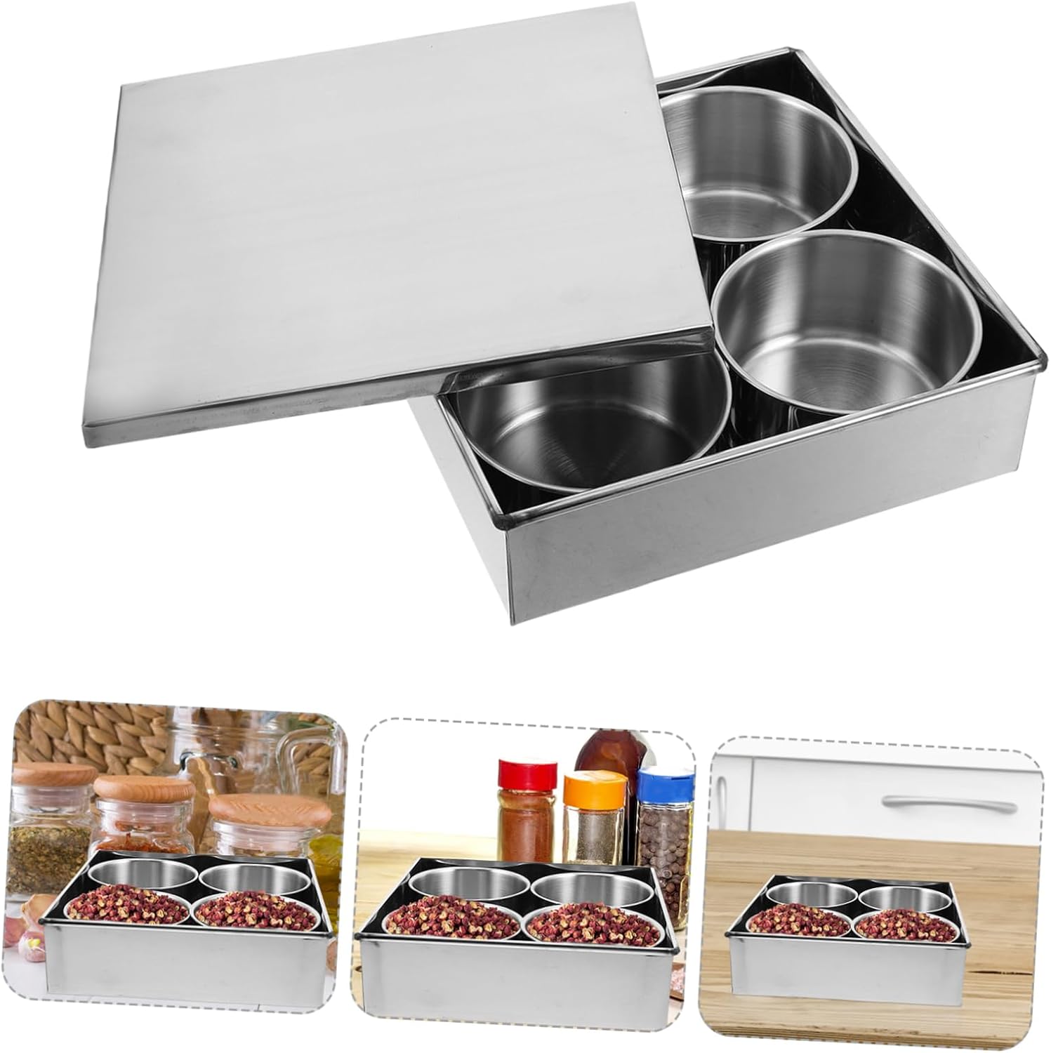 Package List 1 x seasoning box Characteristics -Color:Silver stainless steel seasoning -Japanese style: designed with a minimalist japanese aesthetic, this spice box is both elegant and functional, making it suitable for both home and restaurant use stainless steel seasoning jar -Excellent sealing: the lid is designed to be airtight, preventing moisture from entering and keeping your spices fresh and flavorful seasoning storage case -Versatile use: this box is not only great for storing spices and sauces but can also be used to keep small items like jewelry, and more powder container -Multicompartment design: the stainless steel spice box features four compartments, allowing you to store various seasonings separately for easy access and organization spice container -Material:Stainless steel kitchen spice holder stainless steel -Size:22.70X22.70X6.50cm/8.92X8.92X2.55in spice containers -great material: made from great stainless steel, this seasoning box is built to last and is easy to clean, ensuring longterm use stainless seasoning containerGoods Informationfood storage containers This stainless steel spice box is designed with a sleek, modern aesthetic that complements any kitchen decor.stainless seasoning container Featuring four compartments, it allows for organized storage of various seasonings, spices, and sauces.steel seasoning bin The great stainless steel construction longevity and easy cleaning, making it a practical addition to any household
