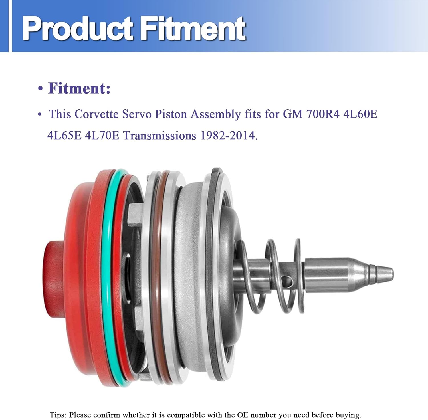Fitment:This Corvette Servo Piston Assembly fits for GM 700R4 4L60E 4L65E 4L70E Transmissions 1982-2014.Function:Corvette servo will offer shorter firmness in 1-2 and 3-4 gears and provide greater torque capability in 2nd gear for 2-4th gears increasing application surface area for greater holding power.Installation:Easy installation. no need to disassemble the transmission.Material:Made of Aluminum alloy, copper and rubber. Premium material provides great reliability in function, performance and quality.Package:Complete Accessory comes with corvette servo piston, upgrade piston cover, snap ring, o-rings.