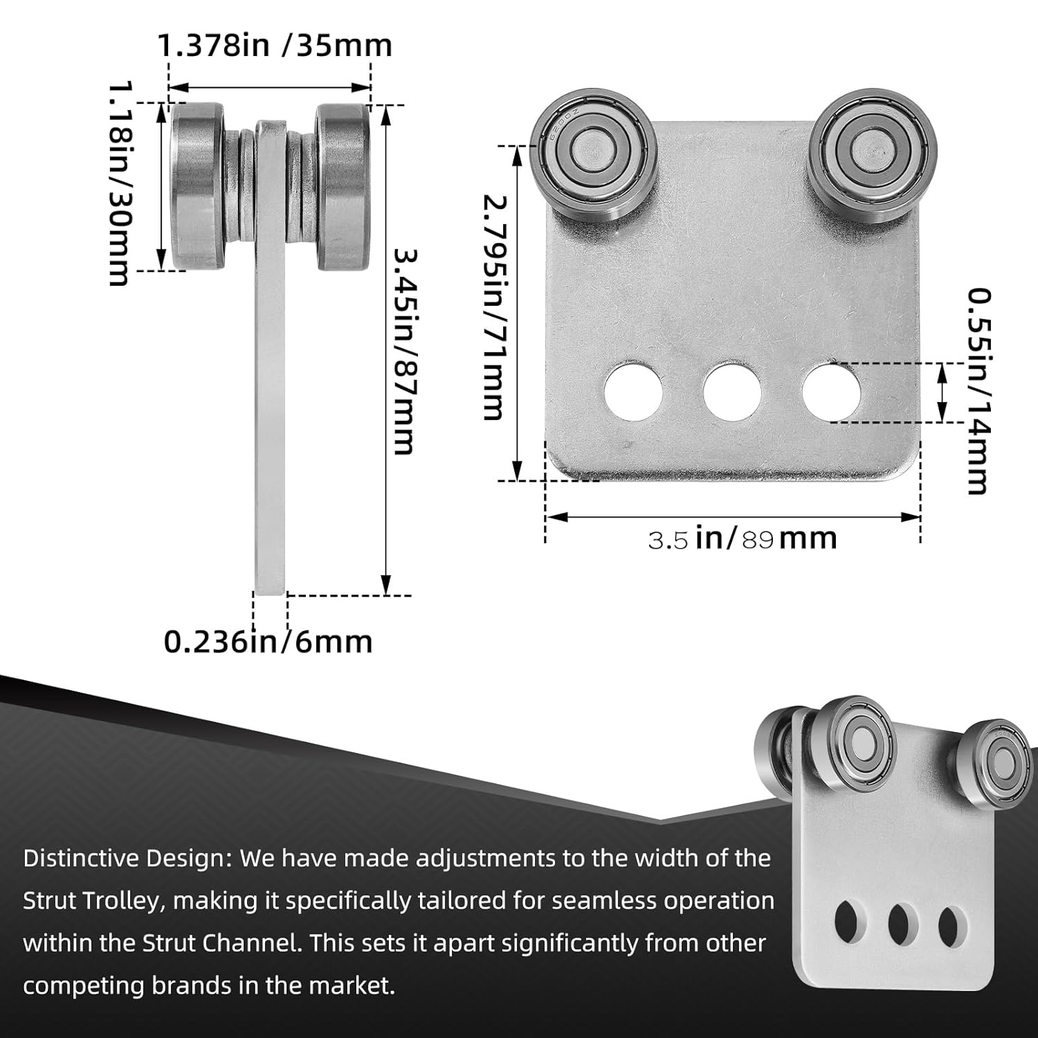 Specification Product Name: 4 Bearing Trolley Assembly Material: Steel Finish: Zinc Plated Steel Trolleys Size:Steel plate thickness1/4" (6mm), Steel plate hole diameter: 9/16" (14mm), Design load: 280 lbs at 600 rpm; 380 lbs at 300 rpm; 450 lbs at 100 rpm. Break strength: 3969 lbs. Heavy Duty Industrial Strength. The Roller trolley is suitable for: all 1-5/8" or higher pillar channels. Trolley Wheel Weight: 477g Advantage Roller Trolley Standard deep groove ball bearing installation is very smooth no noise to it when used. Bearings and pins are firmly welded, work stably, and can be used for a long time. Package included:4 pcs x 4 Wheel Trolley Assembly.