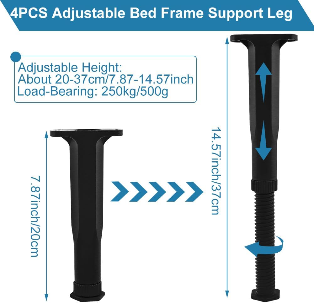 Features:【T-SHAPED】T-shaped adjustable bed frame support leg, simple aesthetic design, practical and beautiful, clear threads, easy to adjust. If the ground is uneven, just twisting the base to adjust【ADJUSTABLE HEIGHT】Adjustable height design, thickened material to create strong load-bearing capacity, no deformation, bid farewell to abnormal noise, allowing you to sleep soundly and no longer suffer from insomnia【STABLE LOAD-BEARING】A fixed cap has been added, with thick threads, which is more stable and has stronger load-bearing capacity than the previous one; the thread pitch is larger, speed adjustment is faster and less labor-intensive.【VARIOUS SCENARIOS】Suitable for beds, sofas, furniture, tables, cabinets, etc., multifunctional and multi scene, adding more beautiful and practical functions to your bedroom and home.【WARM TIP】The nut needs to be removed to adjust to the minimum size; when adjusted to the last 30MM, the spiral feels heavier and will not loosen without the nut (adjustable height: 20-37cm/7.87-14.57inch)Specifications:Type: Adjustable Bed Frame Support LegMaterial: PPColor: BlackLength: About 20cm/7.87inchAdjustable Height: About 20-37cm/7.87-14.57inchLoad-Bearing: 250kgPackage Included:4pcs x Adjustable Bed Frame Support Leg24pcs x ScrewNote:1. Due to the light and screen difference, the item's color may be slightly different from the pictures.2. Please allow 0.5-2 cm differences due to manual measurement.