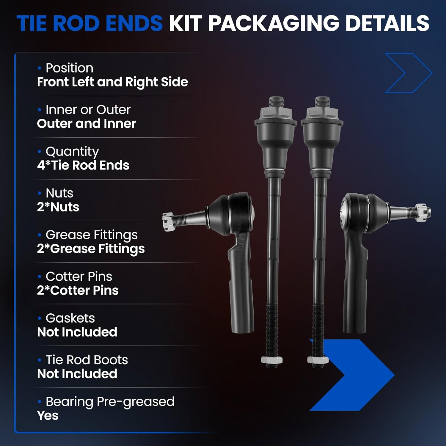 | Included Components | Front Inner Front outer tie rods*2 |