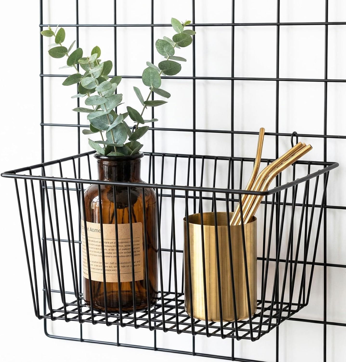 Features: Modern Minimalist Aesthetic Effortlessly complements various modern and minimalist decors. The baskets add a bright, functional accent to your grid display system while enhancing overall storage utility. Boost Efficiency & Organization Keep your workspace, kitchen, or office tidy and efficient. Everything you need—from memos and notes to pens and clips—is within easy reach, streamlining your daily routine. Specifications: Material: metal Color: black Size: hanging wire baskets: 10.83'' L x7.8'' W x 5.67'' H Package includes: 4 x Hanging wire basket 12 x Small S-hooks Notes: Manual measurement, please allow slight errors on size. The color may exist a slight difference due to different screen displays.