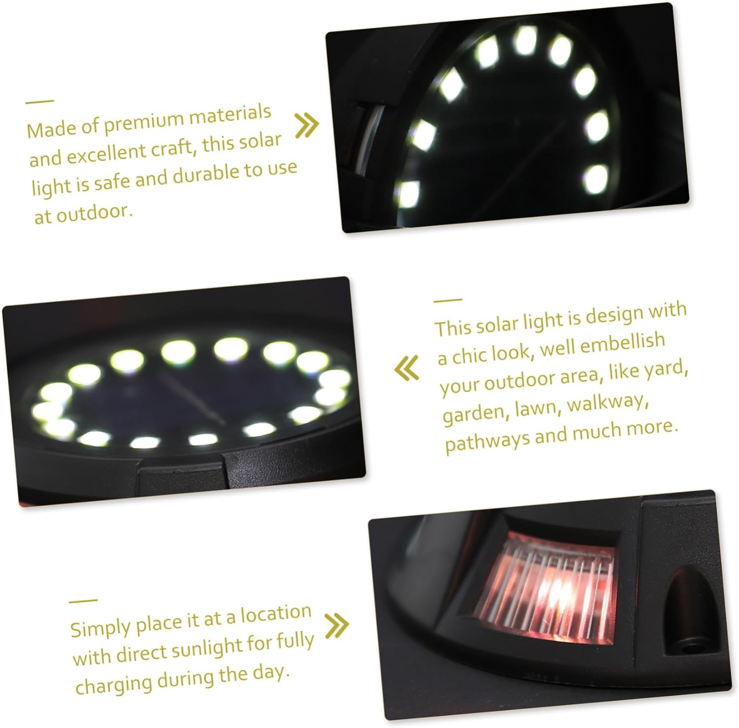 Package List 4 x solar lights Characteristics -Working Time: about 8 hours lawn solar lights -Product Info:Solar underground lamp -Light Color: White light + colorful light outdoor walkway lights -Battery: 1.2V 500mAh solar lights outdoor -Material: ABS, PP, , AL pathway lights solar powered -Solar Panel: 2V 100mA outdoor path lights - This solar light is design with look, well embellish your outdoor area, like yard, garden, lawn, walkway, pathways and much more walkway solar lights. - It is compact in size, will not take up much space, allow you to install it at any place you want landscape path lights. - You can buy it for yourself or give it as a gift for your friends or family on birthday, Christmas and other special days yard solar lights. - It is simple and practical in use, give you a pleasant using experience patio ground lights. - Made of and excellent craft, this solar light is safe and durable to use at outdoor walkway lighting.Goods Informationsolar pathway lights A beautiful solar light to brighten and beautify your outdoor area, easily give your patio or yard a new look.walkway solar lights Simply place it at a location with direct sunlight for fully charging during the day.solar landscaping lights Use this solar powered lamp to upgrade your garden decor