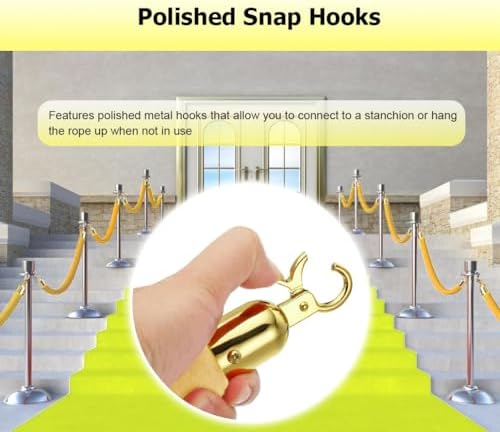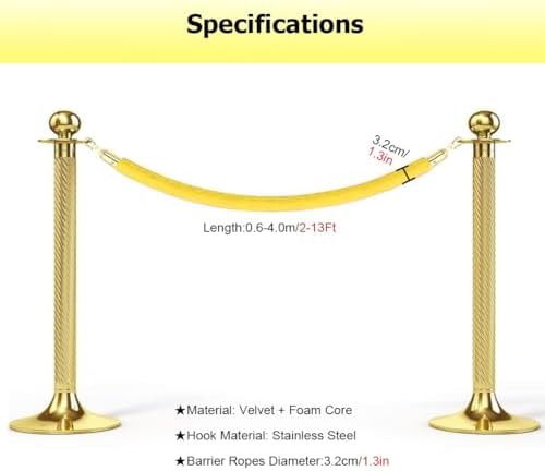 Enhance your event management with our premium crowd control stanchion ropes, designed to organize large gatherings effortlessly. Ideal for various settings such as trade shows, exhibitions, weddings, and corporate events, these ropes provide a sophisticated touch while ensuring smooth crowd flow. Crafted from high-quality velvet with a durable foam core and stainless steel hooks, our stanchion ropes are not only stylish but also built to last. The 3.2 cm diameter offers a sturdy yet elegant appearance, ensuring they stand out at any occasion. With adjustable lengths ranging from 0.6 to 4.0 meters (2 ft to 13 ft), these ropes can be easily customized to fit your specific needs. Key features include: 1. Universal compatibility: Our stanchion ropes work with any type of post, providing versatility for your crowd control solutions. 2. Easy assembly and portability: Lightweight and flexible, these ropes are simple to set up, take down, and store, making them perfect for both temporary and permanent installations. 3. Attractive design: The beautiful appearance of our crowd control ropes enhances the aesthetic of your venue while effectively directing foot traffic. 4. Quick lock and release: Each rope comes with a metal hook, allowing for fast attachment and removal, crucial for busy environments. 5. Effective guidance: Use these ropes to efficiently lead guests to designated areas, ensuring a smooth and orderly experience. 6. Enhanced security: Ideal for blocking off unauthorized access to doors, hallways, elevators, and stairways, these ropes help maintain safety and order. Package includes: 4 x Yellow Stanchion Ropes (Stanchions not included). Please note that slight variations in size (1-2 cm) and color may occur due to manual measurement and lighting conditions. Transform the way you manage crowds and create memorable experiences with our elegant and functional stanchion ropes.