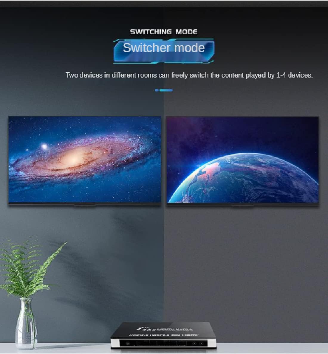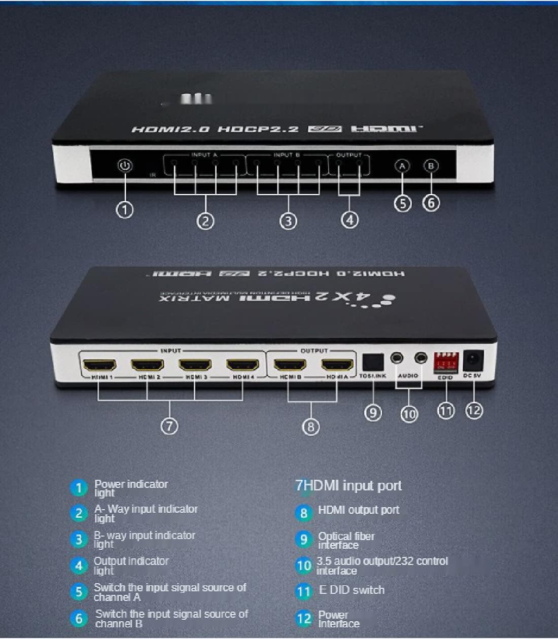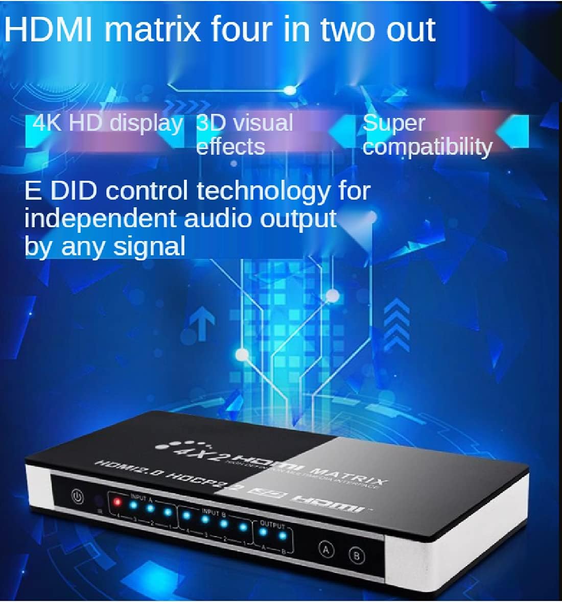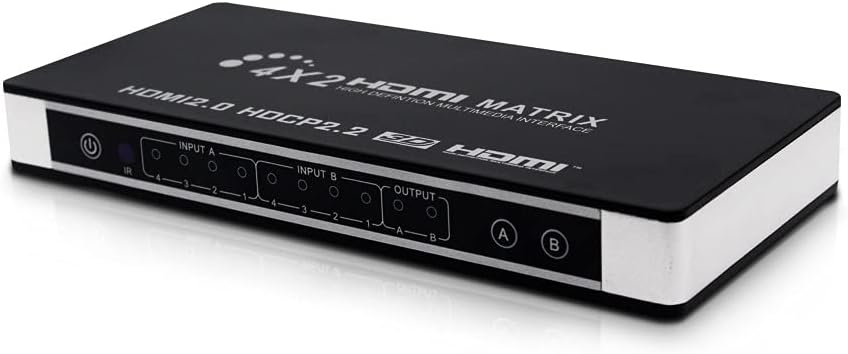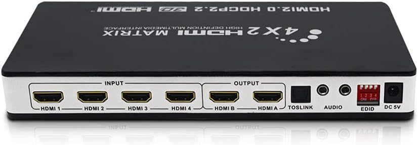 Dear Customer Thank you for purchasing this product. This Matrix 4x2 can connect four high definition sources and two sinks with audio output optical or stereo simultaneously. It can easily switch or split four high definition video sources to two compatible displays or projectors The Optical and stereo audio output can extract audio signal from output A. Our devices offers solutions for noise, space and security concerns,data center control, information distribution, conference room presenation,school and corporate training environments. Specifications HDMI version:HDMl 2.0, HDCP 2.2 HDMI resolution:24/50/60fps/480i/480p/576i/576p/720p/1080i/1080p/4K x 2K@24/25/30fps@60Hz. Support video color format:24 bit/deep color 30bit,36bit,48bit Support audio format..DTS-HD/Dolby-trueHD/LPCM7.1/DTS/Dolby-AC3/DSD Audio output:SPDIF and RCAstereo Max transmission bandwidth….340MHZ Max baud rate:18Gbps Input/Output TMDS signal:0.5~1.5Volts p-p Input/Output DDC signal:5Voltsv p-p(TTL) Input cable distance:<10m AWG24 HDMl standard cable Output cable distance:<10m AWG24 HDMI standard cable Working current:1.3Amax Power adapterformat:Input:AC100V240V(50/60Hz);Output:DC5V/2A Operating Temperature range:(-15 to +55℃) Operating Humidity range:5 to 90%RH(No Condensation) Dimension(LxWxH):218x106x28mm Weight:318q