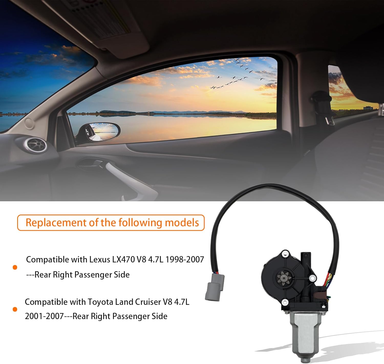 HXHAUTO has extensive experience in power window motor . Through careful design and remanufacturing by our team, we can improve performance and durability while using better materials and efficient technology, so that you can meet the demands of high quality and low cost while shopping happily.Do your Windows not go up or down properly?If your car window have can not lift, pause, weakness, abnormal sound and other problems, may be your Window regulator or window lift motor damage caused by failure, you need to replace in time,this will bring convenience to your life.Product informationAccessories type: Power Window Motor Installation position: Rear Right Passenger Side Anti-Clip Function Included:YES Terminal of connector:5 Pins Mounting Type: Threaded Insert(M5 screws are twisted directly into the aluminum insert) Window Regulator Included: NO Quantity Sold: 1 PieceReference Number:8572060120 47-1173 82-1173 742-636Replacement of the following modelsCompatible with Lexus LX470 V8 4.7L 1998-2007---Rear Right Passenger SideCompatible with Toyota Land Cruiser V8 4.7L 2001-2007---Rear Right Passenger SideTips:Please pay attention to your model, year and installation position before purchase.
