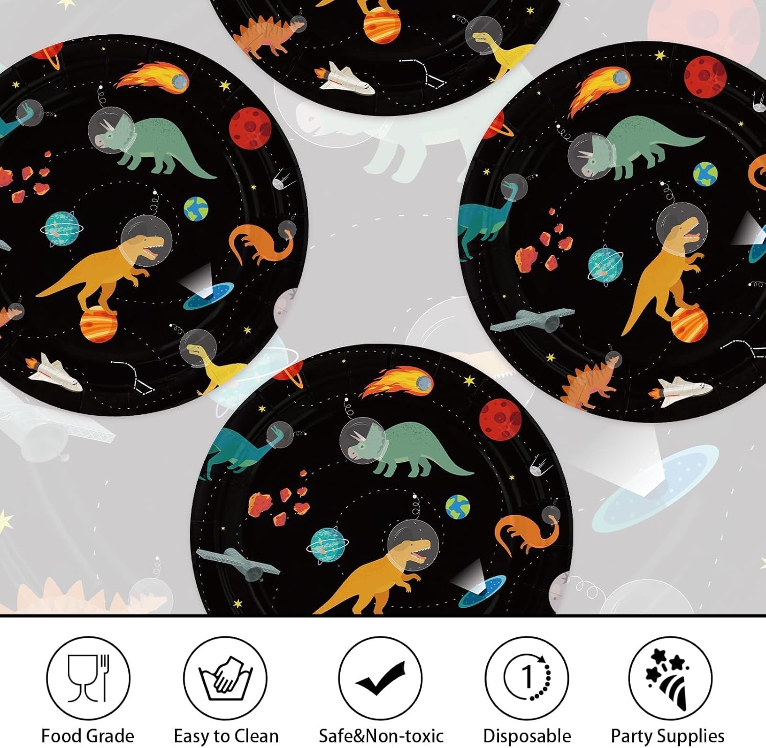 50 Pcs Outer Space Dinosaur Paper Plates 9" Cute Dino Planet Rocket Spaceship Dessert Plates Disposable Cartoon Dinosaur Theme Party Supplies for Kids Boys Outer Space Dino Birthday Party Decorations