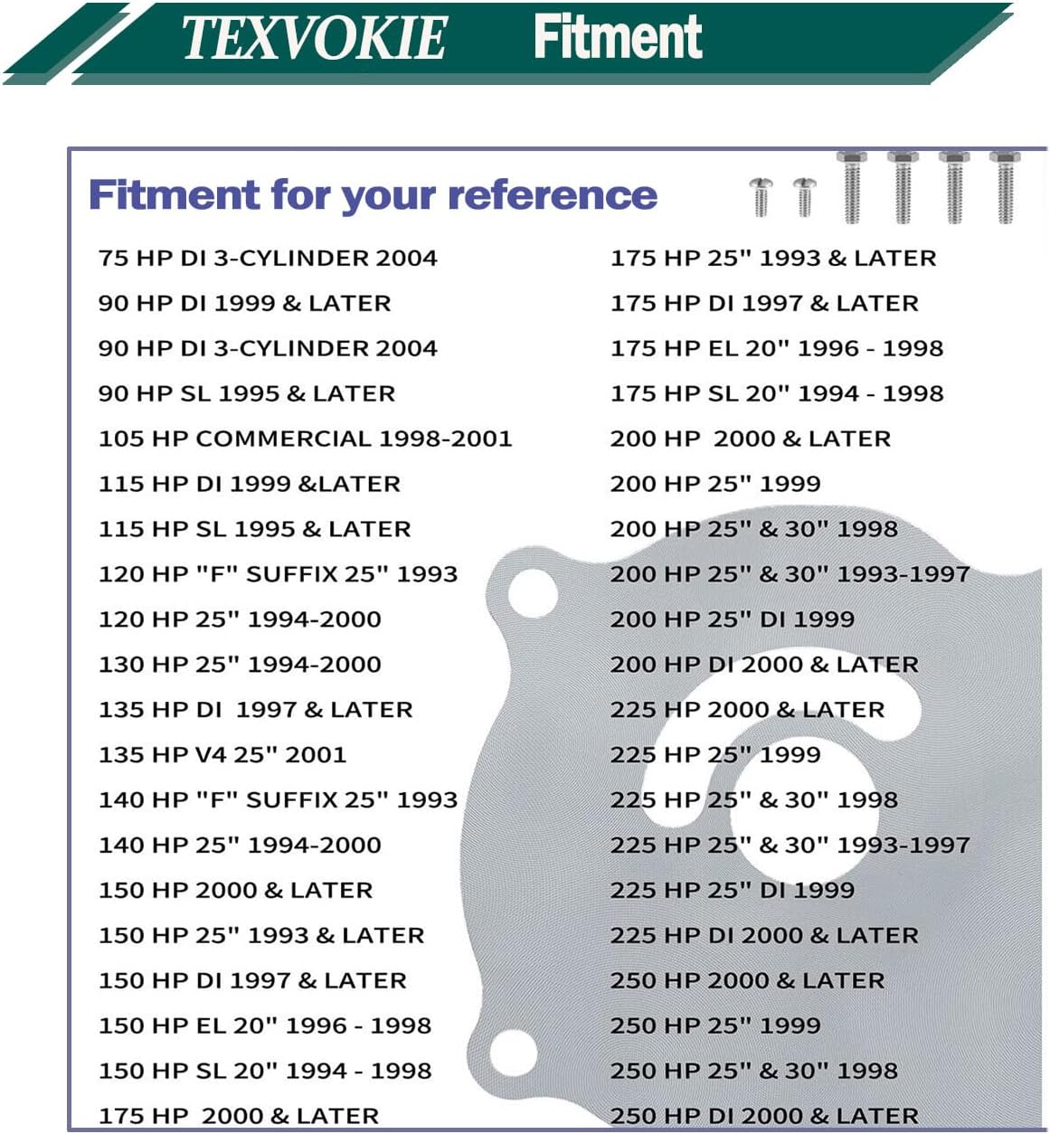 Water Pump Impeller Repair Kit with Housing Fit for Johnson Evinrude 75-250H 5001595 Replace Part OEM #0435929 #0777802 #5001595 Sierra:18-3315-2 Fit Johnson Evirude Engine Models 65 75 80 90 100 105 115 120 125 130 140 150 175 185 200 225 250 300 HP More Detail fitment information: Fits the Following Johnson Evirude Engines 65HP 1997 75HP 2000 80HP 1998 90HP 1995-2000 100HP 1998-00 105HP 1993-00 115HP 1995-00 120HP 1993-94 125HP 1993-98 130HP 1995-98 140HP 1993-94 150HP 1993-00 175HP 1993-99 185HP 1993-94 200HP 1993-00 225HP 1993-99 250HP 1993-98 300HP 1993-95 Package Contains the Following Components: 1 X Impeller (w/ Key) 5001593 1 X Impeller Gasket 324701 338484 1 X Grommet 320943 1 X Grommet 321008 1 X Grommet 314008 1 X Cup & Plate Assembly 435027 1 X Impeller Key 334897 2 X Stainless Steel Bolt 306643 4 X Stainless Steel Bolts 319126 1 X O-Ring 309731 310585 1 X O-Ring 331188 1 X Water Pump Housing 435959 5007968 1 X Impeller Housing Seal 321120