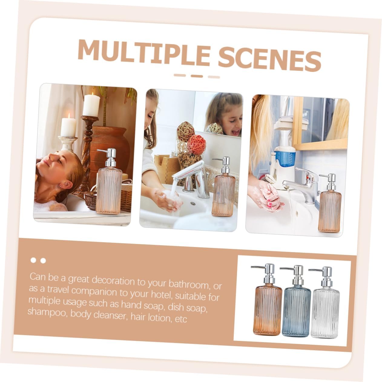 Package Include 3 x Shampoo Bottles Features - Size: 20.20X8.00X8.00cm/7.94X3.14X3.14in Sub-packing Lotion Bottle - Material: Glass Shampoo Bottle Containers - Color: Orange, gray, transparent Soap Dispenser - It is use for liquid soap, dish soap, lotion, aromatherapy essential oil blends, shampoo, etc Soap Dispenser Bottle. - Fashion design easy to match the decoration style of your bathroom or kitchen countertop Soap Dispenser Bathroom. - Made of glass material, smooth texture, modern style, strong and Refillable Shampoo Bottle. - Just press the pump and it dispenses the right amount of soap for your needs Press Pump Bottle. - 500ml of liquid, adding a contemporary touch to your bathroom or kitchen Soap Dispenser Countertop.Goods DescriptionSub-packing Lotion Bottle Fine craft and delicate design make it suitable for liquid storage and decoration.Soap Dispenser Bottle For home, office or public use.500ml Bottle It is made of glass material for long-term use.Kitchen Soap Dispenser This item is a refillable dispenser bottle for shampoo, liquid, soap or others storage