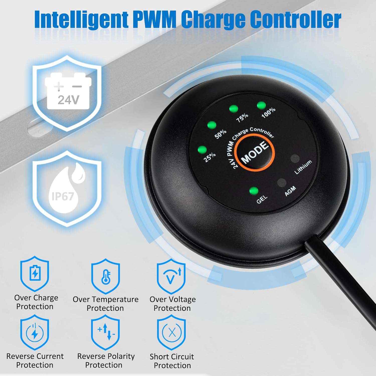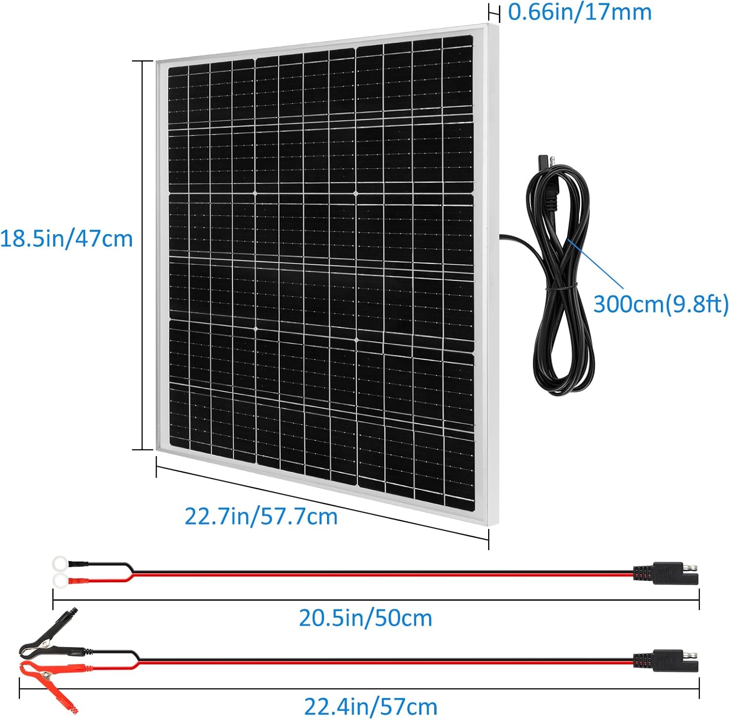 Monocrystalline Solar Panel (Compact Design)50 Watt 24 Volt50 Watt 12 Volt Monocrystalline Solar Panel is the key component of a system when going off the grid. Equipped with alligator clips and O-rings, the connection cable is SAE connector, easy to connect and install.It is widely used in recreational vehicles, tractors, cars, trailers, trucks, motorcycles, ships, ATVs, surveillance cameras, alternators, tool sheds, lawn mowers, electric bicycles, electric fences, pickup trucks, water pumps, golf carts, door openers, snowmobiles, to charge and maintain your batteries.Mechanical DataSolar Cell:MonocrystallineMax. Voltage(Vmp):36VPWM Controller: 24VOpen Circuit Voltage(Voc):40.32VShort Circuit Current:1.56AMax. Current:1.39AFrame:Aluminum alloy frameLength of Extension Cable:300cm(9.8ft),0.75mm²(18AWG)Solar Panel Weight:2.75kg (6.06lb)Size:470x577x17mm(18.5x22.7x0.67 in)Mount Bracket:NoWaterproof Degree: IP67What You Get:1* 50W 24V Solar Panel1* 24V PWM Charge Controller1* SAE Extension Cable1* Solar Cables(O-ring Cable)1* Solar Cables(Alligator Clip)1* English Operation Manual