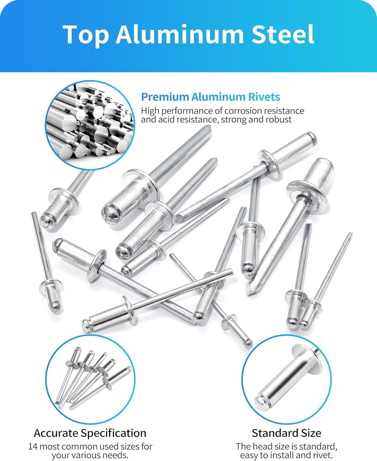 | Included Components | 1/4" x 3/8"(15pcs), 1/4"x 1/2"(10pcs), 1/8"x 1/4"(40pcs), 1/8"x 5/16"(40pcs), 1/8"x 3/8"(50pcs), 1/8"x 1/2"(50pcs), 3/16"x 5/16"(30pcs), 3/16"x 3/8"(30pcs), 3/16" x 1/2"(30pcs), 3/16"x 5/8"(20pcs), 3/32"x1/4"(60pcs), 3/32"x 5/16"(60pcs), 5/32"x 3/8"(40pcs), 5/32"x 1/2"(35pcs) |