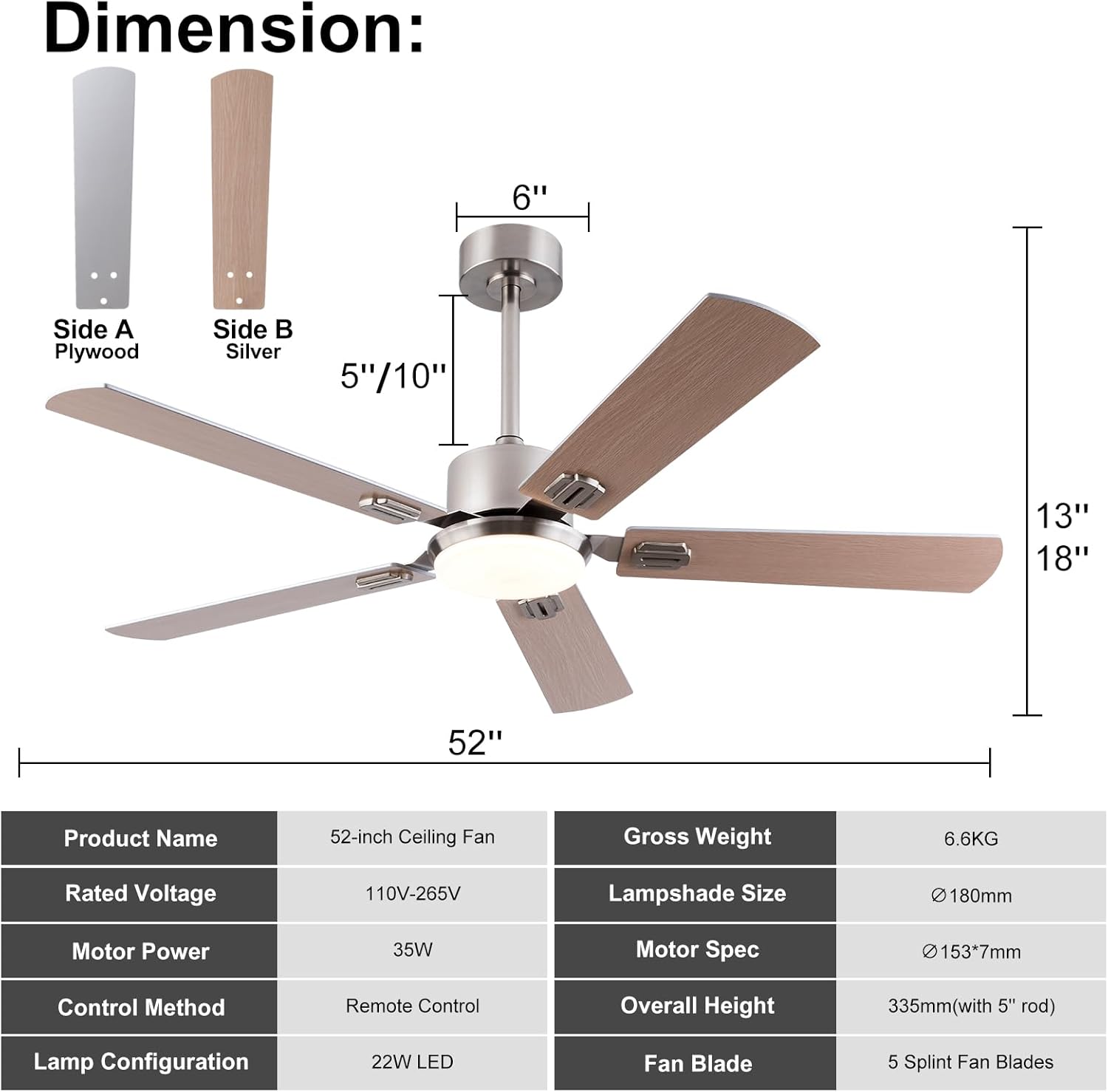 | Special Features | 52 Inch Ceiling Fan with Adjustable 3 Color LED Lights and Lighting Memory, 52 inch Ceiling fan with 6 Speed Remote Control, Ceiling Fan Light with 5 Double-sided Wooden Fan Blades, DC Ceiling fan has Forward and Reverse Function, Modern Black Ceiling Fan with Light |