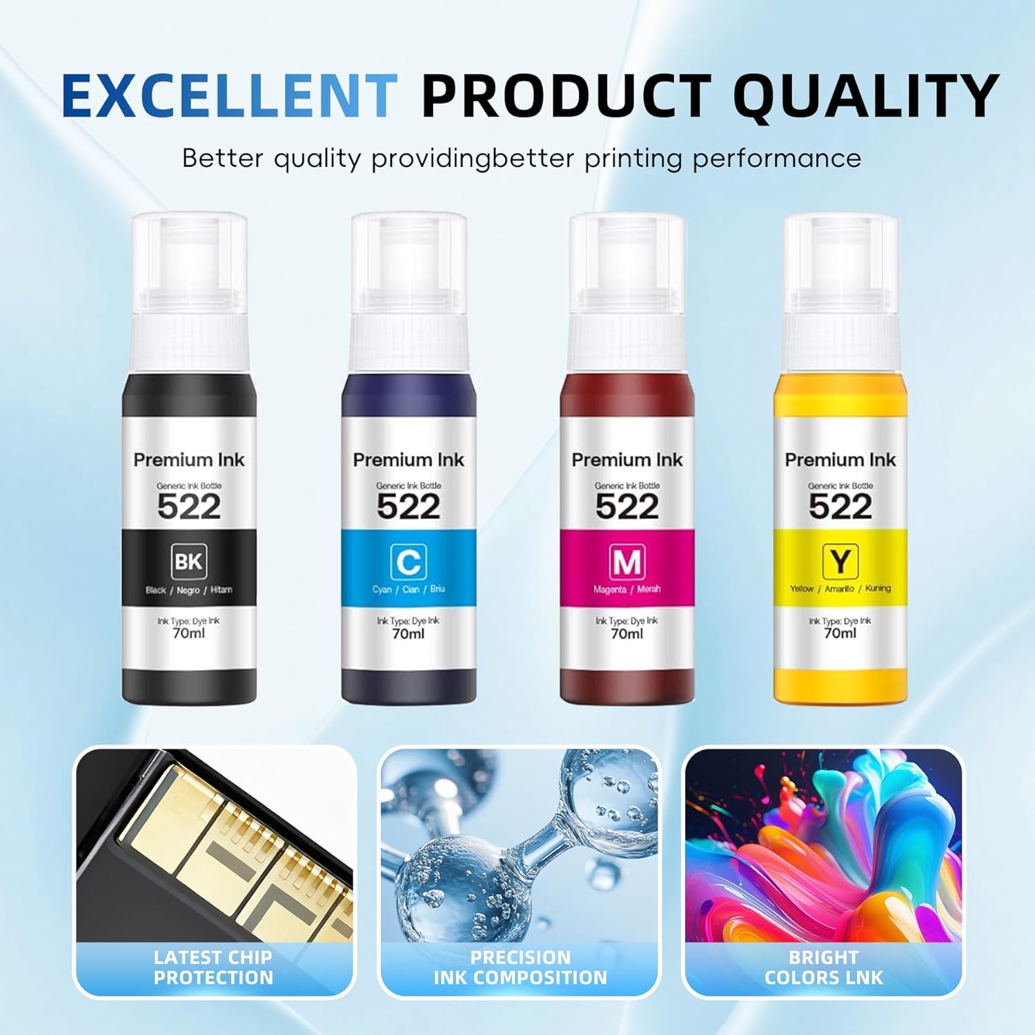 522 Ink refill bottles Replacements for Epson 522 ink refill bottles Compatible Epson printer ET-2800 ET-2803 ET-2720 ET-2400 ET-2840 ET-4800 ET-4810X (Black Cyan Magenta Yellow,4 Pack)