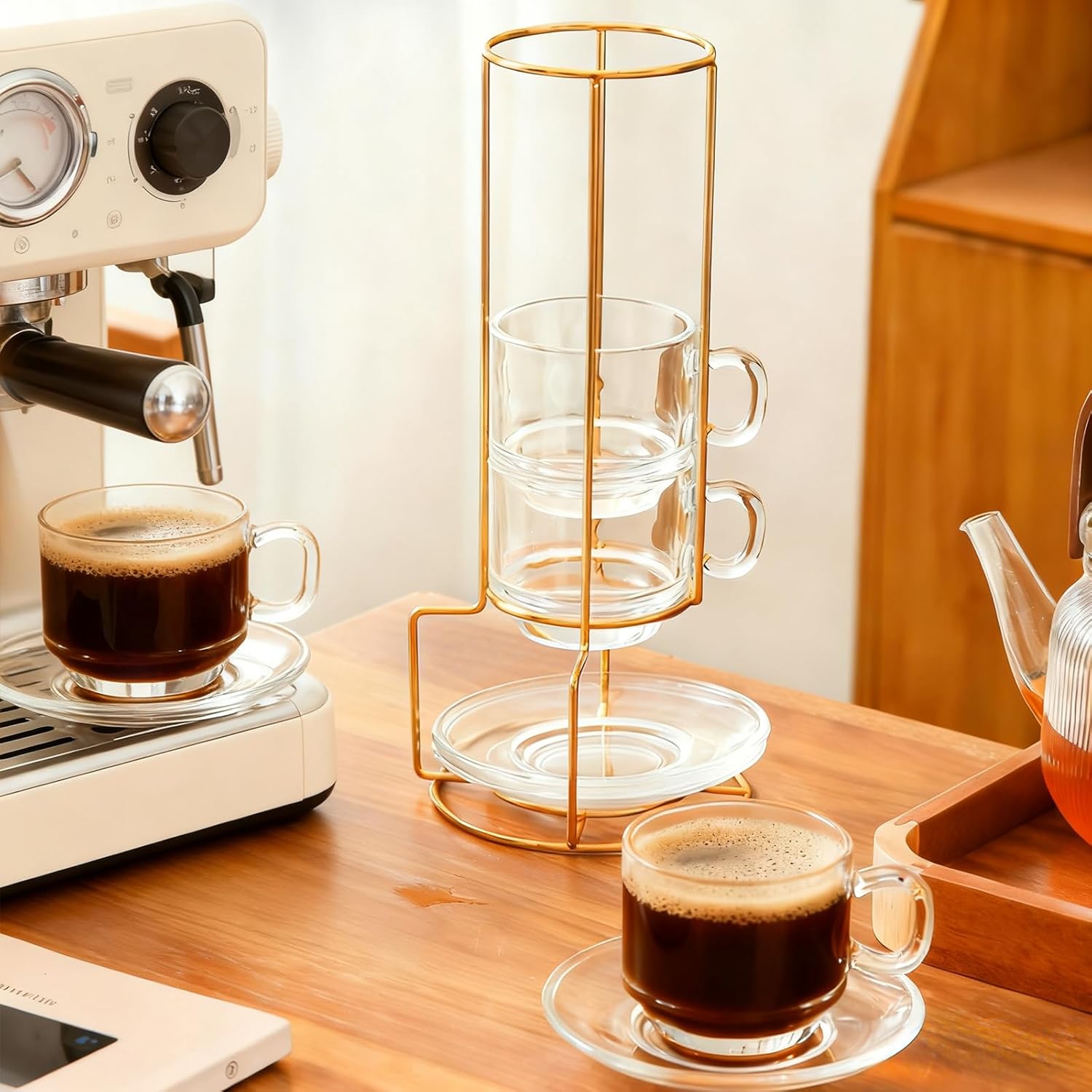 DetailsProduct Name:Espresso Cups SetSet Includes: 4x Espresso Cups + 4x Saucers + 4x Stirring Spoons + 1x Storage RackCup Capacity: 5.4 oz (160ml)Color: Cups & Saucers: Clear; Spoons & Holder: GoldMaterial: Cups & Saucers: Glass; Spoons & Holder: MetalUsageFor espresso, cappuccino, latte, and tea.Suitable for home, office break rooms, and coffee shops.This combination set is designed specifically for espresso machines, making it the perfect choice for enjoying coffee with loved ones, friends, or clients.Features1. Glass coffee cup material—a healthy way to enjoy espresso-based drinks2. Stackable storage—Cappuccino cups stack neatly in the included storage rack to save space