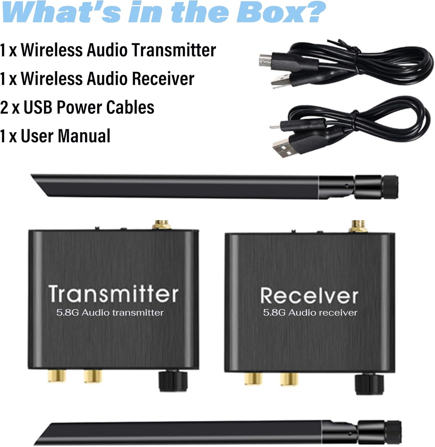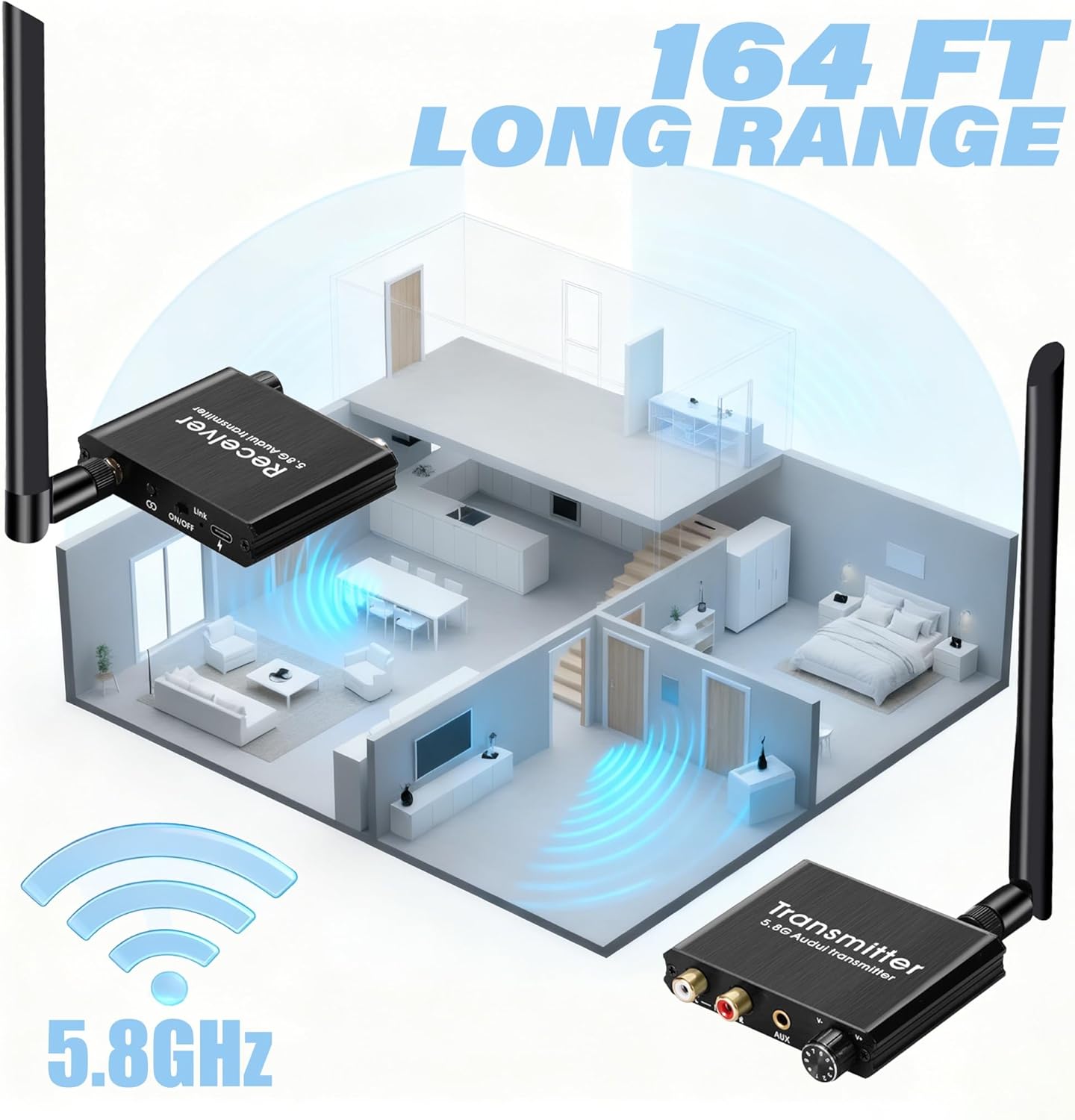 The Ultimate Wireless Subwoofer AdapterFinally, place your subwoofer where it sounds best, not just where the cable reaches! This complete wireless subwoofer kit instantly eliminates the need for long, messy RCA cables. It flawlessly transmits deep bass and LFE signals, making it the perfect wireless subwoofer adapter for any home theater system or powered sub.Convert Any Wired Speaker to WirelessDon’t replace your favorite speakers—make them wireless! This home theater sound system is expertly designed to convert wired to wireless speakers. It works perfectly with powered bookshelf speakers, soundbars, and studio monitors, giving you the freedom to create a clean, cable-free multi-room audio setup anywhere in your home or office.Pro-Grade Wireless Audio Transmitter and ReceiverExperience rock-solid performance with the advanced wireless audio transmitter and receiver. Using 5.8GHz technology with high-gain antennas, it delivers a stable, uncompressed audio stream up to 164ft. The 18ms ultra low latency ensures your audio stays perfectly synced with your video, ideal for movies and gaming.Plug & Play, Universal ConnectivitySetup is incredibly simple. Just connect the wireless audio transmitter to your source (TV, AV Receiver, PC) and the receiver to your speaker using the included RCA or 3.5mm jacks. The units pair automatically, creating a robust wireless link in seconds. It’s the easiest way to achieve a professional wireless setup.Built-In Volume Control & Rugged DesignThis is more than a simple wireless subwoofer adapter; it’s a complete solution. Featuring two-way volume control and a durable all-metal housing, this wireless subwoofer kit is built to last. Fine-tune your audio levels directly on the units and enjoy the peace of mind that comes with a high-quality, interference-resistant design.Important NotesThis device transmits AUDIO ONLY, not video.Transmission range can be affected by physical obstacles (walls, floors) and wireless interference (Wi-Fi routers, etc.).Your speakers/subwoofer must be powered (active) or connected to an amplifier. This kit does not power passive speakers.Technical SpecificationsRange: Up to 164 ft (Line of Sight)RF Frequency: 5.8GHzSNR: 67dBPower Consumption: TX: 5V/110mA | RX: 5V/110mABody Material: Aluminum AlloyOperating Temperature: -40°F to 185°F (-40°C to +85°C)What’s in the Box1 x Wireless Audio Transmitter1 x Wireless Audio Receiver2 x USB Power Cables1 x User Manual