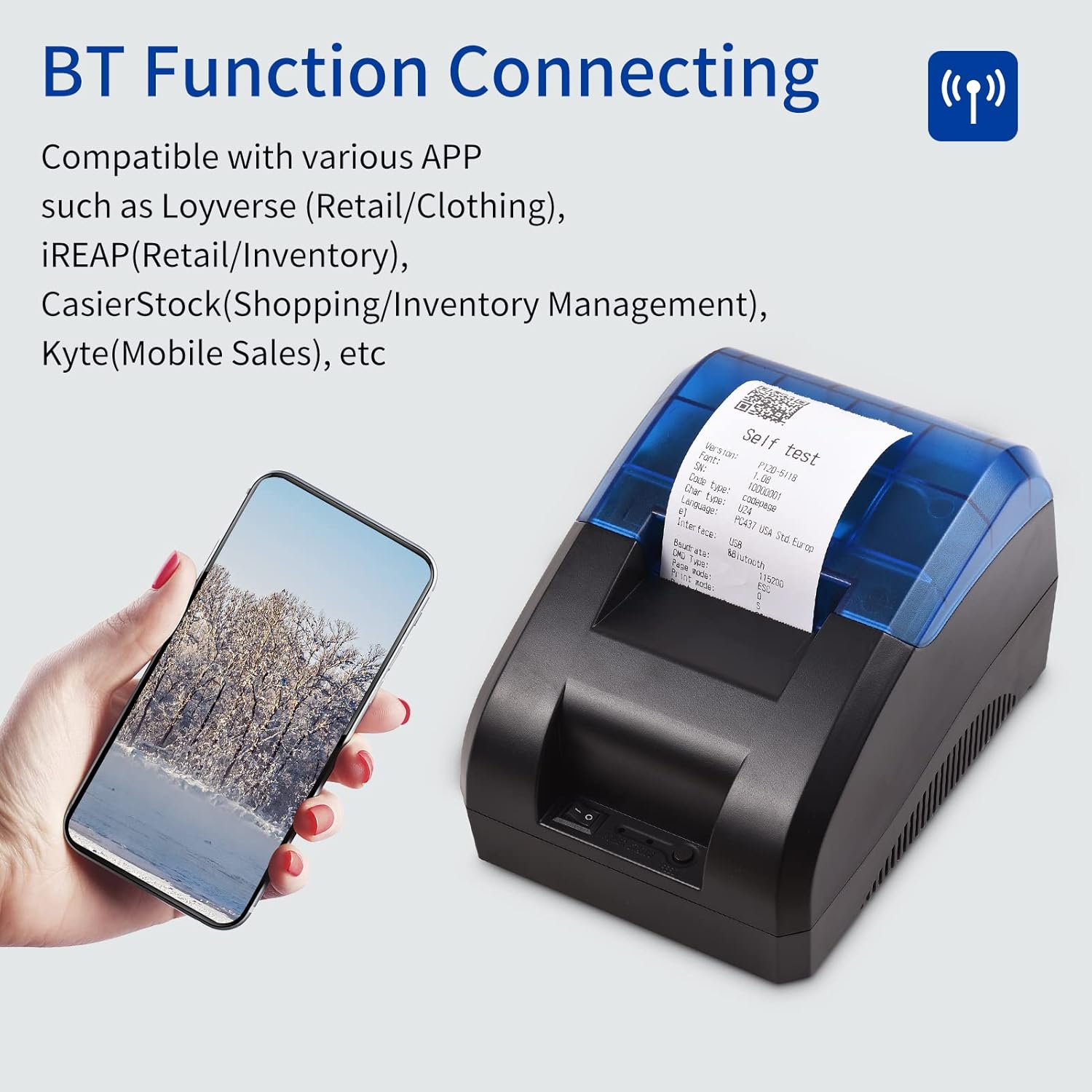 /> Printing Speed: 60mm/Second Paper Width: 57±0.5mm Paper Roll Dia.: ≤60mm Paper Feed Metd: Easy feed(Clameshell feed) Commands: ESC/POS Power Adaptor: Input: AC 100V-240V,50-60Hz; Output: DC 12V/3A Casher Drawer Output: DC 12V/1A Interface Type: USB+BT Line Spacing: 3.75 mm(Can adjust line spacing by command) Line No.: Font A:32 character /Line; Font B:42 character/Line; Simple, traditional Chinese-16 lines Character: Standa GB18030 simplified/traditional Chinese Fonts Character Size: ANKcharacter,Font A:1.5x3.0mm(12×24dots) Font B: 1.1x2.1mm(9x17dots) Simplified/Traditional Chinese: 3.0x3.0mm(24x24 Dots) Bar code &Character: Extended character set - PC437/Katakana/PC850/PC860/PC863/PC865/West Europe/Greek/He/EastEurope/Iran/WPC1252/PC866/PC852/PC858/IranII/Latvian/Arabic/PT151,1251/PC737/WPC/1257/ThaiVietnam/PC864/PC1001/(Latvian)/(PC1001)/(PT151,1251)/(WPC1257)/(PC864)/(Vietnam)/(Thai) Bar code - UPC-A/UPC-E/JAN13(EAN13)/JAN8(EAN8)CODE39/ITF/CODABAR/CODE93/CODE128 Graphics printing: Supports bitmap download and print Print Head Life: 50KM(print density≤12.5) Driver: , IOS, Li, Win2000, Win2003, WinXP, Win7, Win8, Win8.1, Win10 Package Weight: 740g/21.6oz Package Size: 18.5x14x14/7.2x5.5x5.5in Note: 1. Please download the driver via http://www.dgkinkon.com/res/soft/2021/b2b7e8617220caa3.zip 2. Suitable for smartpne APP-Loyverse (Retail/Clothing), iREAP(Retail/Inventory), CasierStock(Spping/Inventory Management), Kyte(Mobile Sales), etc. Please make sure your cellpne is compatible with these software. Packing List: 1 x Thermal receipt Printer 1 x Paper Roll 1 x Power Cable 1 x USB 2.0 Cable 1 x User Manual