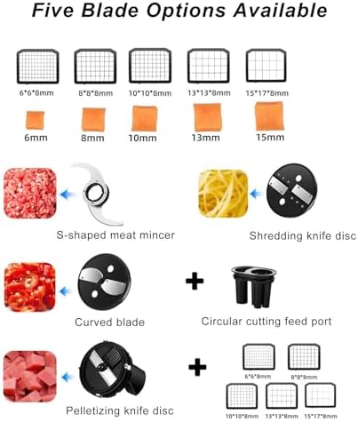 Introducing our versatile electric vegetable dicing machine, designed to streamline your food preparation process and elevate your culinary creations. Featuring a spacious 2.55-inch feed opening, this machine allows you to process whole carrots and other larger vegetables without the need for additional cutting, saving you time and effort in the kitchen. Ideal for both home cooks and commercial kitchens, our dicer offers four distinct cutting options: ground meat, diced, shredded, and sliced. With customizable dicing molds available in sizes ranging from 6mm to 15mm, you can easily adjust your cuts to match your recipes and preferences, offering endless possibilities for your meal preparations. This powerful 600W electric vegetable cutter is engineered for efficiency and precision, achieving an impressive working efficiency of up to 50kg every 20 minutes. Whether you’re preparing a large family dinner or managing a bustling restaurant kitchen, this machine is designed to handle substantial quantities of fruits and vegetables with ease. Constructed from durable PC and stainless steel, our 5L capacity fruit chopper is built to last, making it a reliable addition to your kitchen equipment. Its compact design (26*25*48cm) ensures that it fits conveniently on your countertop while providing robust performance. Included in the package are essential accessories such as a shredding disk, slicing tray, and various dicing plates, ensuring you have everything you need for versatile food preparation. Experience the convenience and efficiency of our electric vegetable dicer and take your cooking to the next level. Whether you’re preparing for a family gathering, meal prepping for the week, or operating a food business, this multifunctional machine is your go-to solution for quick and consistent results in the kitchen.