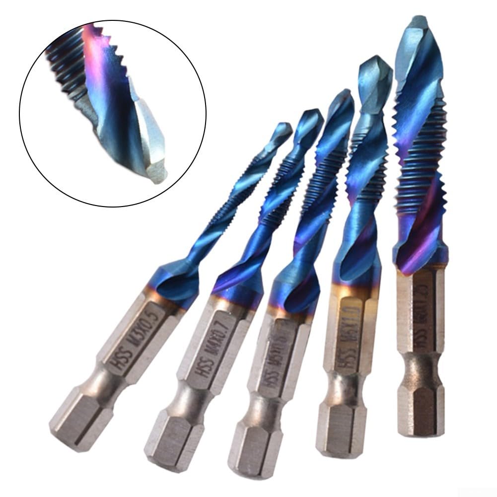 Product description Features:*Sturdy Material:Made of high-speed steel(HSS), these drill tap bits are highly sturdy and resistant to rust, a longer lifespan.*Multiple Sizes Included:This set includes a total of 5 drill taps in different sizes ranging from for M3 to M8, allowing you to tap various thread sizes according to your needs.*Spiral Flutes Design:The taps are designed with spiral flutes, which enhances the chip cleaning process, resulting in smoother and more efficient tapping.*Drilling and Tapping Combined:These drill tap bits have both drilling and tapping functions, enabling you to drill a hole and cut new threads simultaneously, saving both labor and time.* for versatile Applications:Suitable for drilling, tapping, and cutting on soft metals, aluminum plates, iron, and other similar materials, making them for versatile tools for various projects.Specifications:*Product Name:Drill Tap Bits Set*Material:High speed steel(HSS)*Size:Approx. for M3, M-four, M5, M6, M8*Total length:About 67-70 mm*Bit length:About 5-10 mm*Shank Diameter:About 1/4-inch/6.35 mm*Color:Blue*Application:For drilling, tapping, cutting on soft metal, aluminum plate, iron and more.Package Content:5* Drill Bits Manufacturer Contact Information no