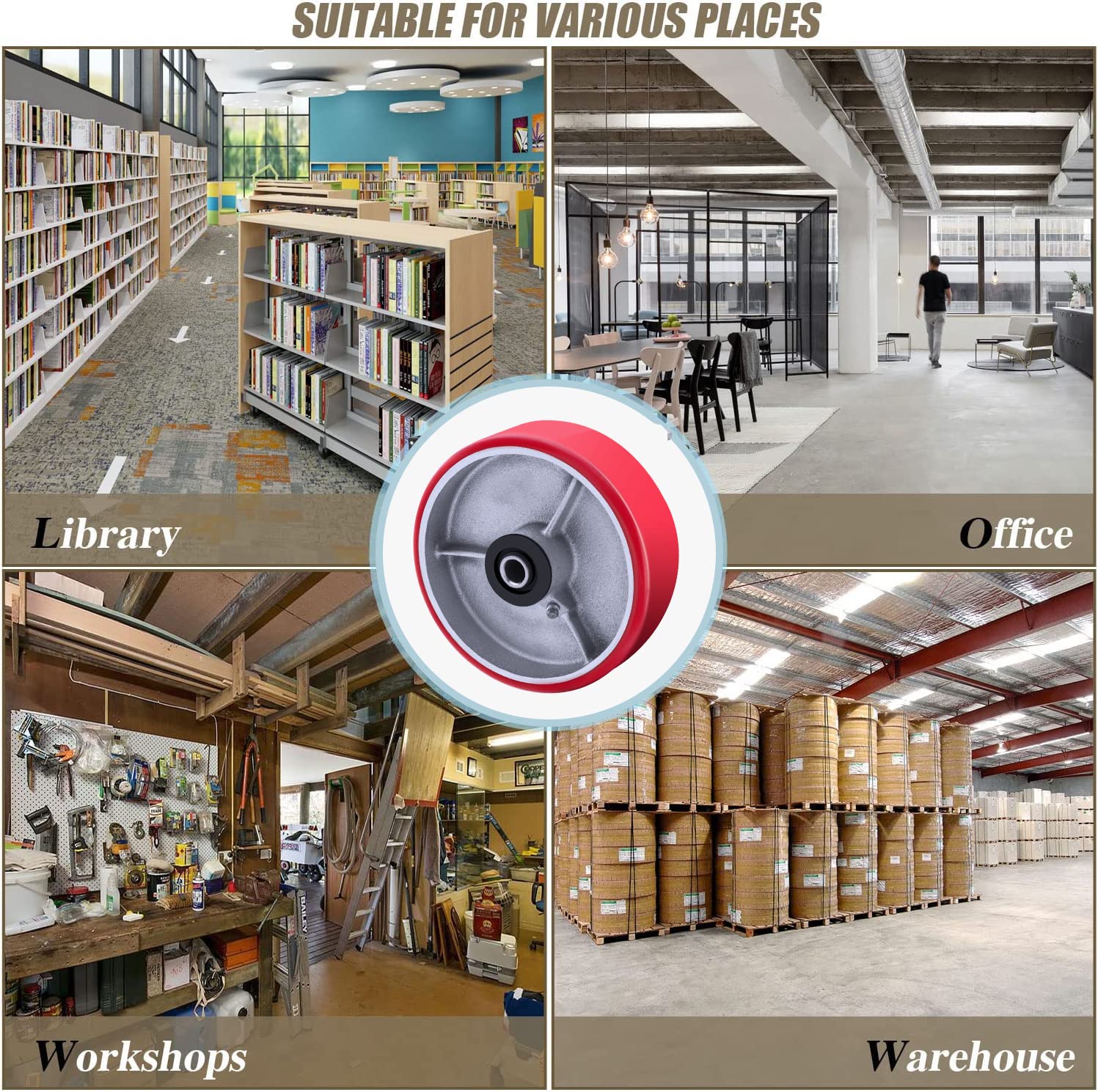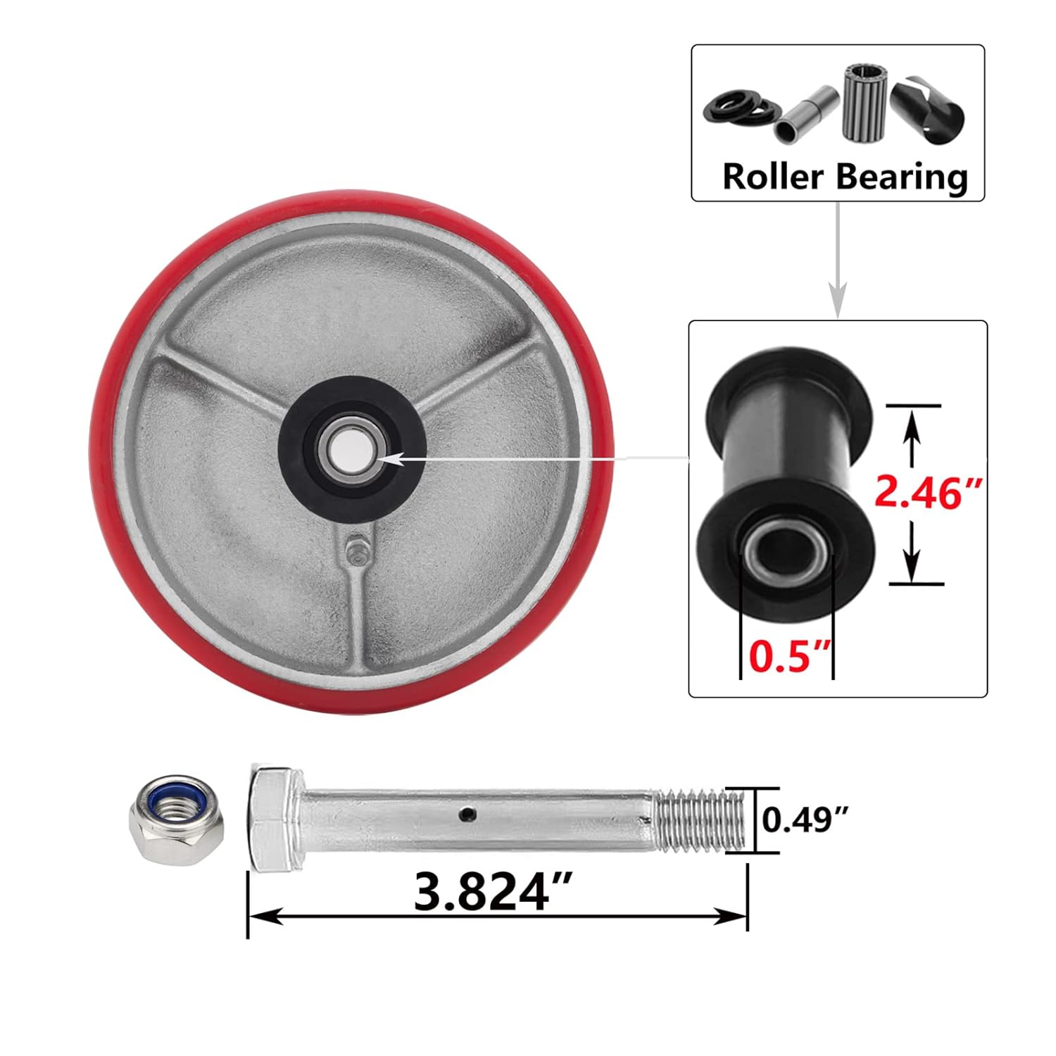 Product specifications: Wheel material: Polyurethane Wheel diameter: 5 inches Wheel width: 2 inches Load capacity: 4000LB Wheel color: Red Number of Casters Wheel: 4