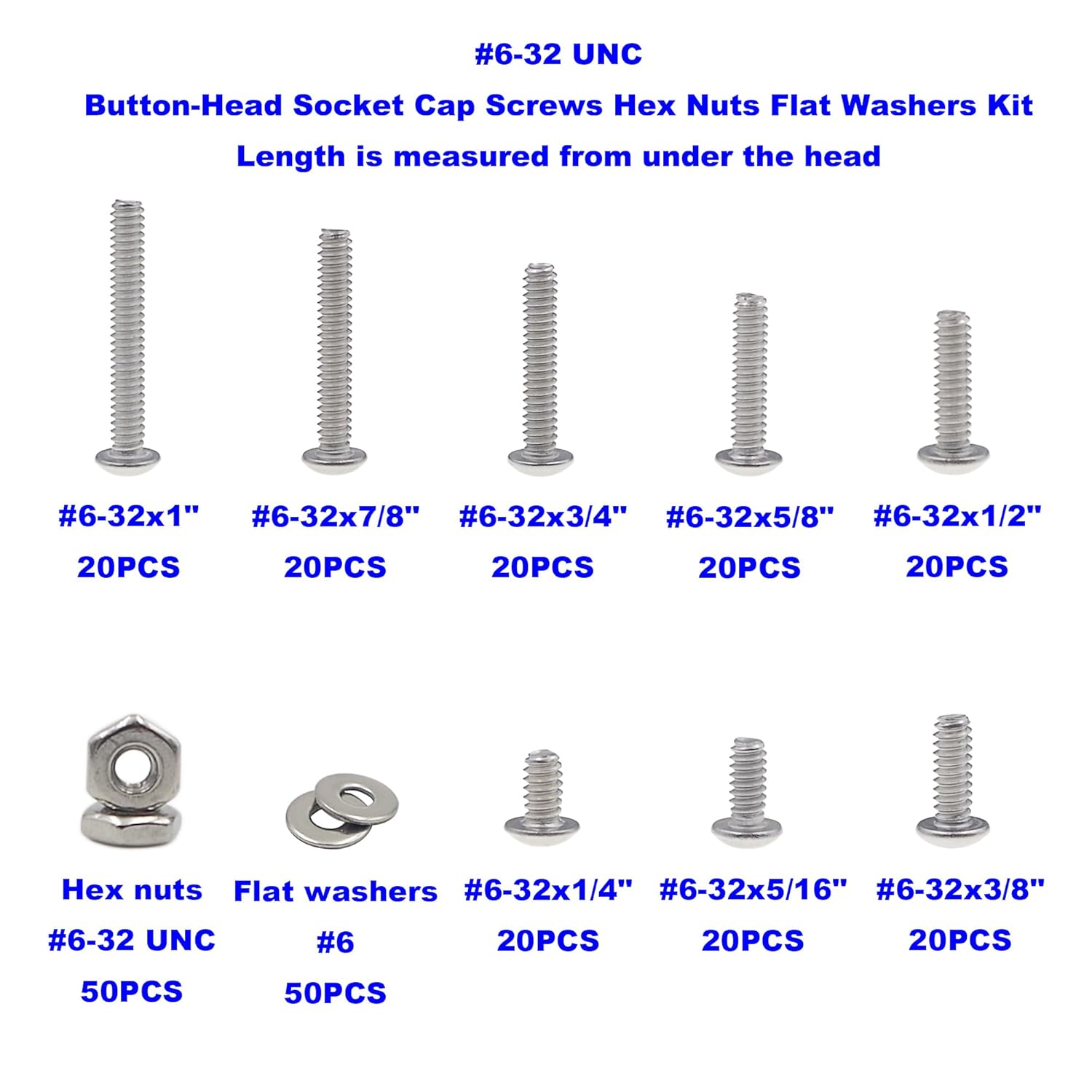 Product description: The button head provides a wide bearing surface, a low head, and a finished appearance These screws are fully threaded,unless noted Length is measured from under the head They are Made from 304 Stainless steel,have good chemical resistance and may be mildly magnetic Not recommended for high-strength fastening Material: 304 Stainless Steel Color:Silver Drive System:Hex socket Head Style:Button Head Package include: 260PCS #6-32 UNC 304 Stainless Steel Button-Head Socket Cap Screws Hex Nuts Flat Washers Assortment Kit #6-32 UNC Button-Head Socket Cap Screws Flat Washers and Nuts Kit total 260 pieces. Comes with the plastic box: List(Type,Thread/Length,Quantity): Button Head Cap Screws--------#6-32x1/4" ------------20PCS Button Head Cap Screws--------#6-32x5/16"-----------20PCS Button Head Cap Screws--------#6-32x3/8" ------------20PCS Button Head Cap Screws--------#6-32x1/2" ------------20PCS Button Head Cap Screws--------#6-32x5/8" ------------20PCS Button Head Cap Screws--------#6-32x3/4" ------------20PCS Button Head Cap Screws--------#6-32x7/8" ------------20PCS Button Head Cap Screws---------#6-32x1"--------------20PCS Hex Nuts-----------------------#6-32-------------------50PCS SAE Flat Washers-----------------#6--------------------50PCS Packing contents: MCMASKE 260PCS #6-32 UNC 304 Stainless Steel Button-Head Cap Screws Hex Nuts Assortment Kit Comes in a plastic box