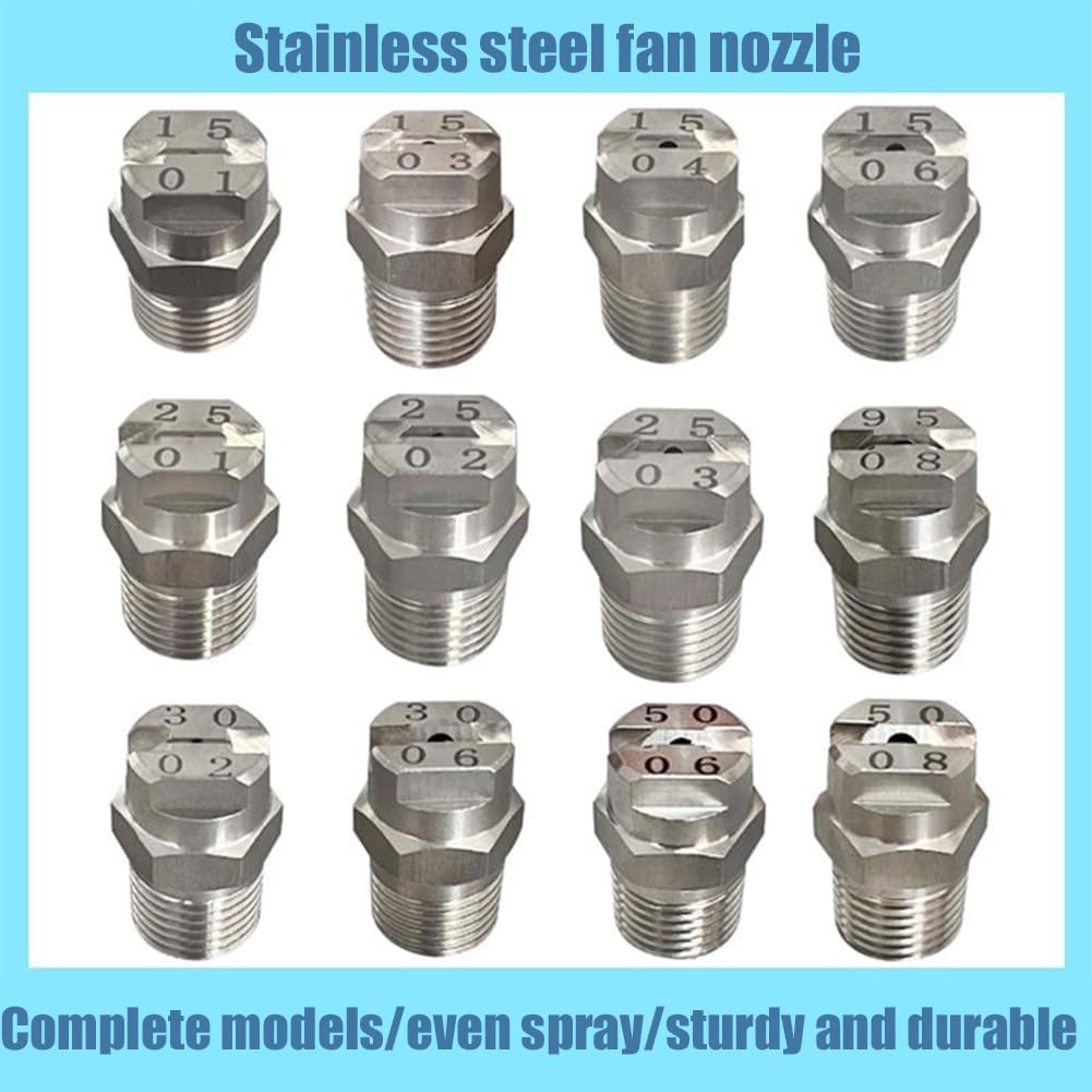 Packaging: 1/8, 1/4, 3/8, 1/2 nozzle optional, 0.03-0.14 inch (0.66-3.6 mm) nozzle diameter optional, including 6 high-pressure washer surface cleaning nozzles, water broom universal replacement spiral nozzle, chassis cleaner, surface cleaner.Nozzle material: Made of 304 stainless steel, which has strong corrosion resistance, is more durable, has good quality and can be used for a long time. Product details: There are multiple sizes of 1/8-1/2 to choose from, the nozzle size is 0.03-0.14in (0.66-3.6mm), multiple sizes are available for you to choose, the spray angle is 25°/40°/50°/65/80°/95°/110°. Product Application: Universal replacement auger nozzle for water brooms, undercarriage cleaners, surface cleaners, dust cleaners. Please note: If the nozzle is blocked by sand or other debris, you can remove the nozzle, clean it with a needle, and then rinse it with clean water.