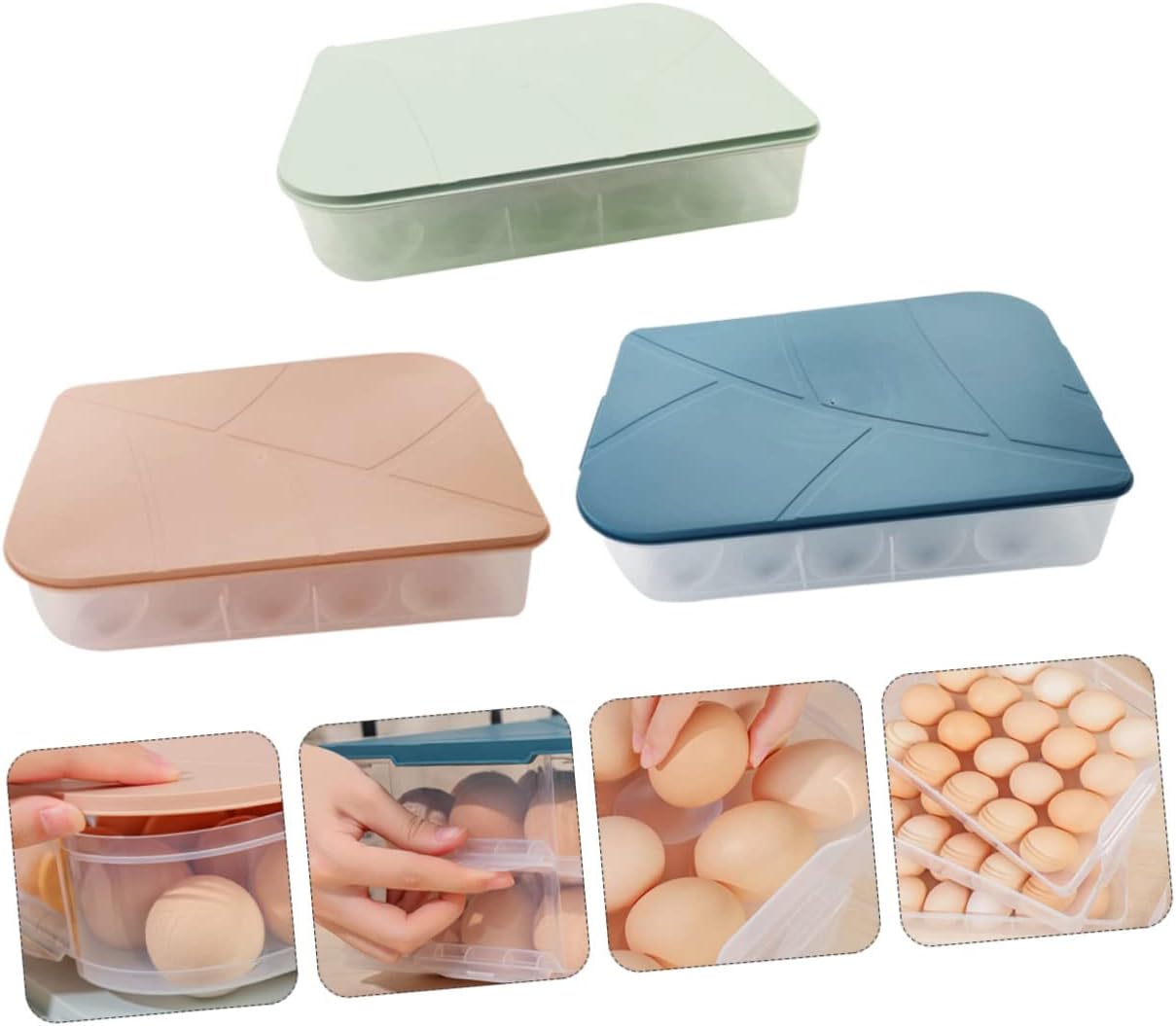 Package Include 6 x egg boxes Features -Color: Blue, Green, Pink Transparent Egg Box. -Material: PP Household Kitchenware. -Size: About 30.00X21.30X6.00cm/11.79X8.37X2.36inch Egg Tray. - Made of premium PP material, safe, environmental protection and odorless, great for egg storing Egg Box. - It can effectively prevent the egg from colliding and breaking Storage Box. - 20 compartments large capacity, storage and more space saving Egg Storage Tray. - Large capacity storage and keep your eggs place orderly in your fridge Refrigerator Egg Box. - Our refrigerator egg storage box is made to provide reliable and repeated use Egg Storage Box.Goods Informationrefrigerator egg bins You can also send them to your mum, friends, etc.egg tray for fridge These egg storage boxes are perfect for storing your eggs in kitchen.plastic cutlery organizer Made of PP material, durable and practical for use.plastic pallet It is practical to use and a must-have for your refrigeratorre-usable
