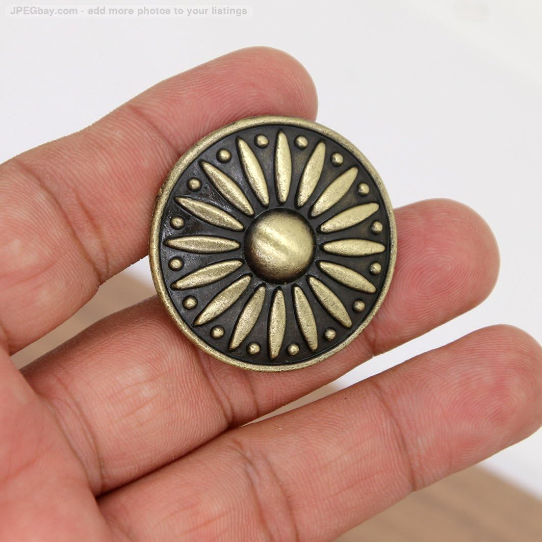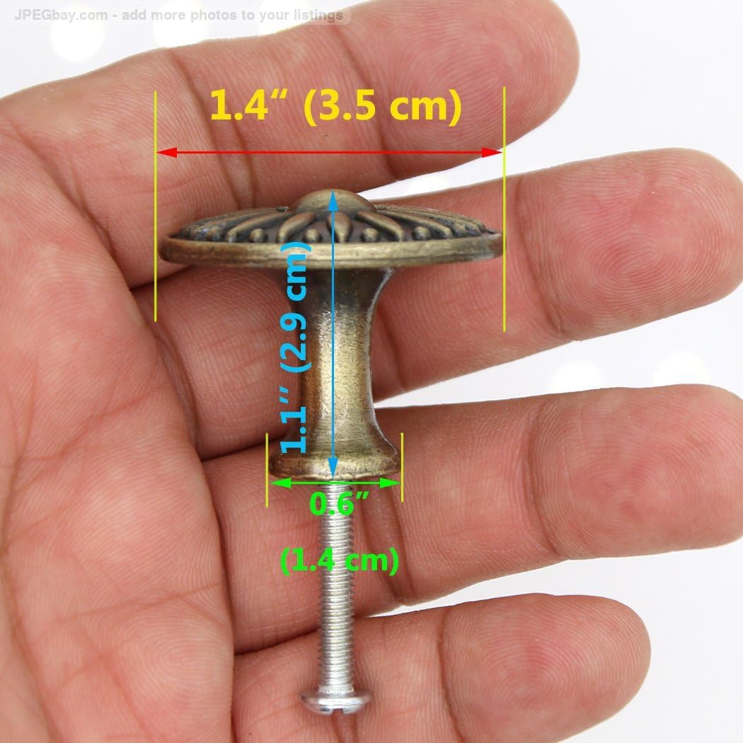 These knob pulls are made by forging zinc alloy and finished with antique brass. With the vintage style, they are perfect for decorating your old or new cabinets. --Designed in antique flavor and made of high-quality zinc alloy. The knob pull is durable and anti-rust. --Knob diameter: 1.4-in (3.5 cm); Height: 1.1-in (2.9 cm). -- Pack of 6 and mounting screws with length of 1 inch are included.